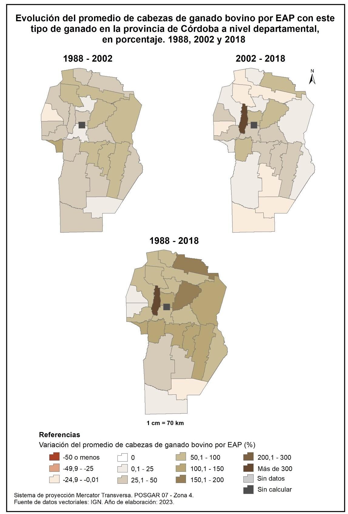Figura 4.5. Evolución del promedio de cabezas de ganado bovino por EAP con este tipo de ganado en la provincia de Córdoba a nivel departamental, en porcentaje. Años 1988, 2002 y 2018.