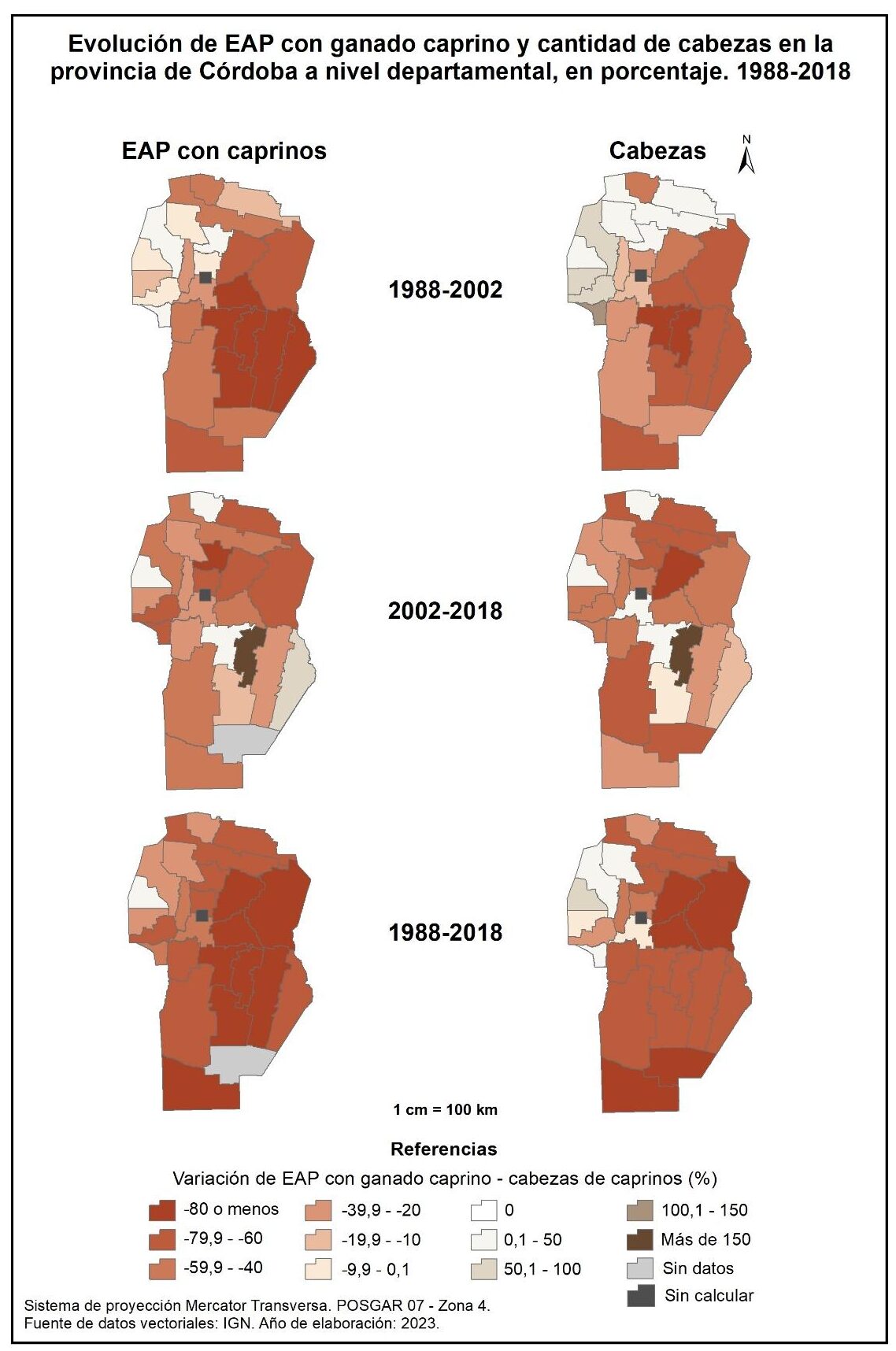 En cuanto al corte temporal total (1988-2018) son los departamentos del oeste provincial los que registran incrementos de hasta el 60%, entre los que sobresale Minas. En tanto que en el resto de la provincia se evidencia una disminución en la cantidad de cabezas caprinas, más marcada en el caso de Río Primero, Río Segundo, San Justo, Presidente Roque Sáenz Peña y General Roca con reducciones de más del -80%.