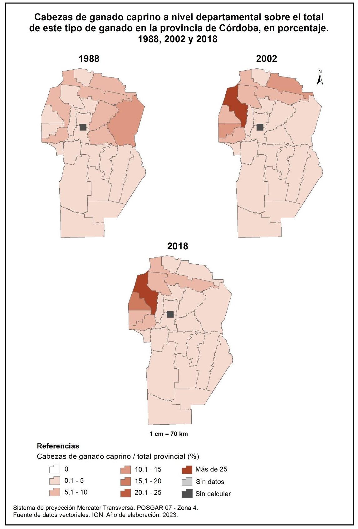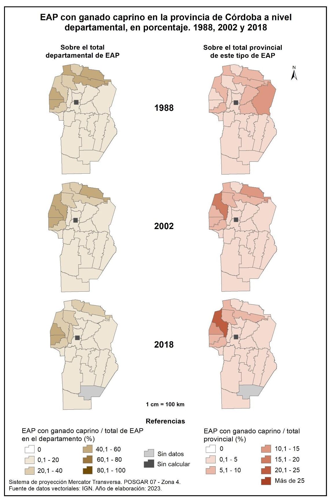 Figura 4.7. EAP con ganado caprino en la provincia de Córdoba a nivel departamental, en porcentaje. Años 1988, 2002 y 2018.
