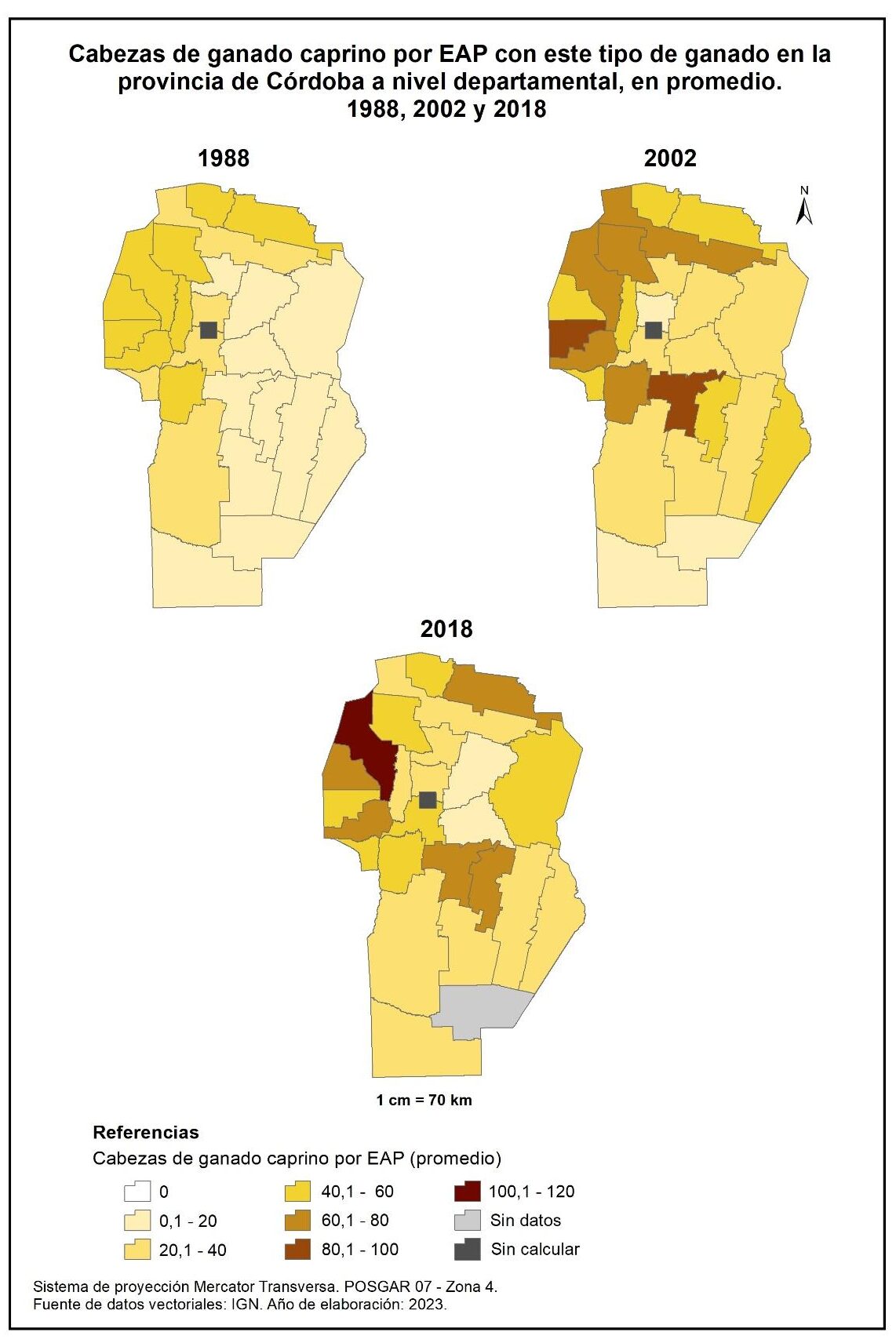En el año 1988, los departamentos del norte y oeste son los únicos que detentan un promedio de más de 40 cabezas caprinas por EAP. En tanto que en 2002 este promedio es de más de 60 cabezas por explotación, del que se destacan Pocho y Tercero Arriba con 89 y 87. Por su parte, en 2018 los promedios más altos continúan concentrándose en los departamentos del nor-noroeste, así como en Tercero Arriba y en General San Martín. En este sentido, sobresale Cruz del Eje con un promedio de 105 cabezas por explotación.