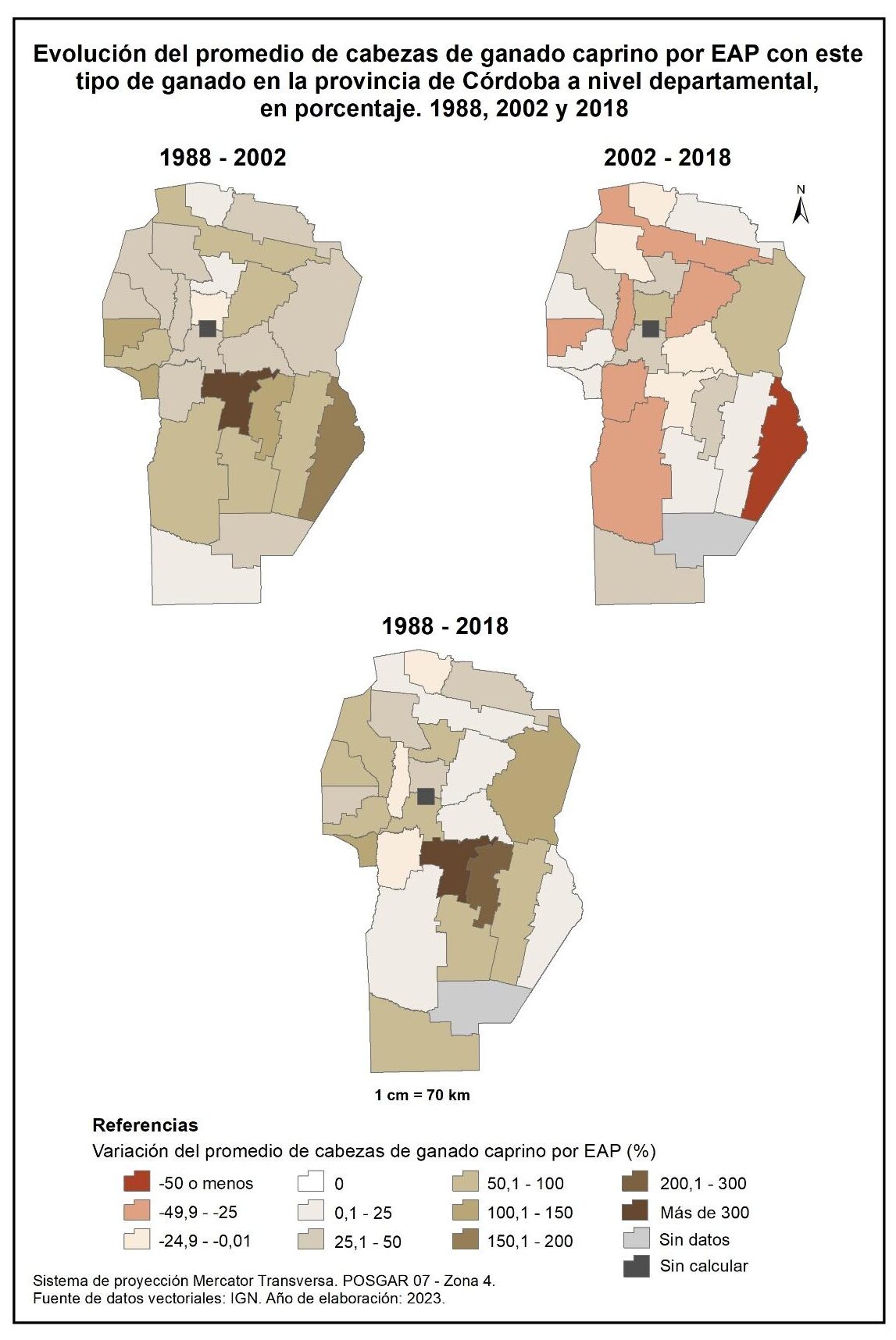 Figura 4.10. Evolución del promedio de cabezas de ganado caprino por EAP con este tipo de ganado en la provincia de Córdoba a nivel departamental, en porcentaje. Años 1988, 2002 y 2018.