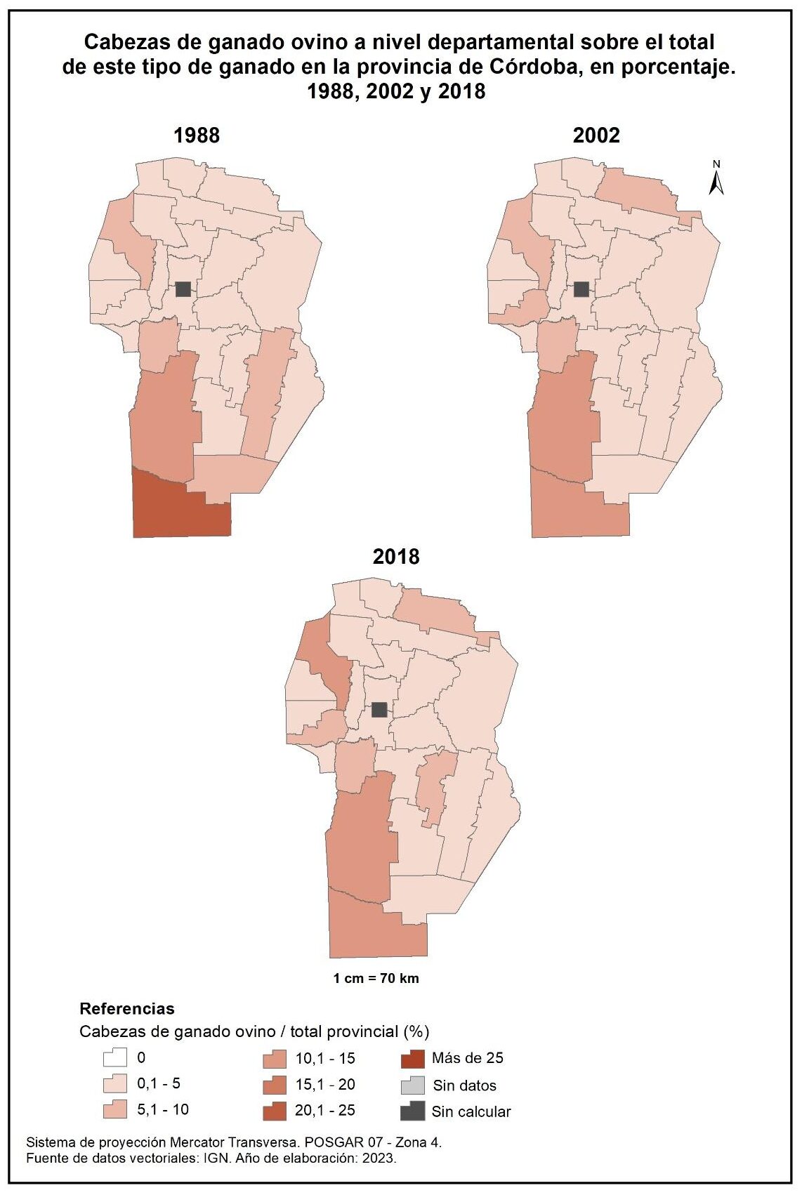 Figura 4.13. Cabezas de ganado ovino a nivel departamental sobre el total de este tipo de ganado en la provincia de Córdoba, en porcentaje. Años 1988, 2002 y 2018.