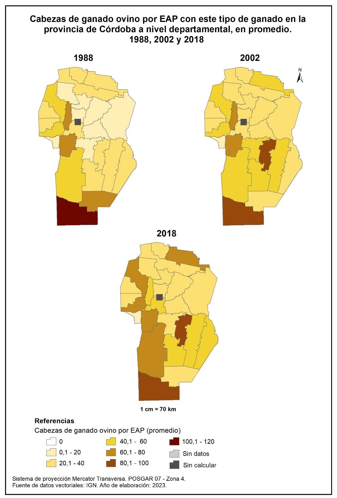 Figura 4.14. Cabezas de ganado ovino por EAP con este tipo de ganado en la provincia de Córdoba a nivel departamental, en promedio. Años 1988, 2002 y 2018.