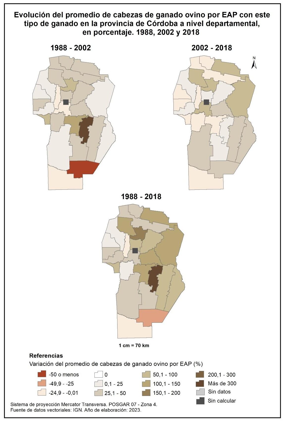 Figura 4.15. Evolución del promedio de cabezas de ganado ovino por EAP con este tipo de ganado en la provincia de Córdoba a nivel departamental, en porcentaje. Años 1988, 2002 y 2018.