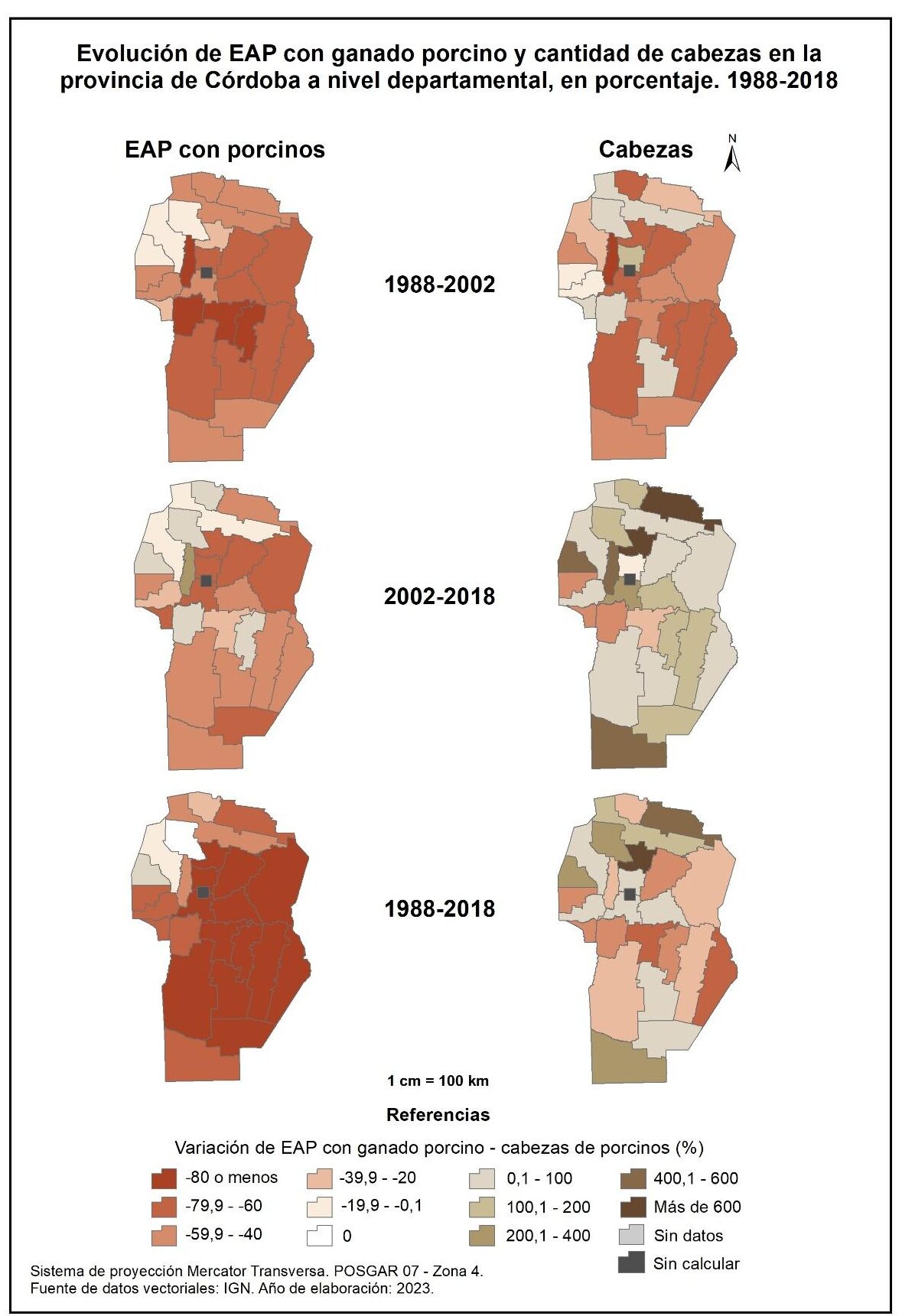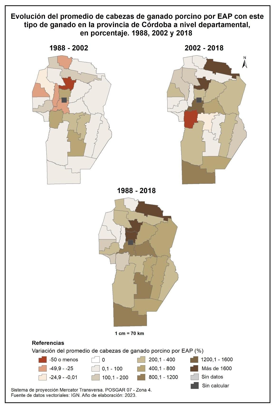 En la totalidad del corte temporal analizado (1988-2018) la mayor parte de la provincia muestra una marcada disminución de EAP con ganado porcino, con un valor promedio del -81%. La excepción la constituyen los departamentos del norte y oeste que presentan, o bien una disminución mínima –Sobremonte y Cruz del Eje–, o bien un aumento en la cantidad de EAP con caprinos, como en el caso de Minas, mientras que Ischilín no presenta variación alguna.