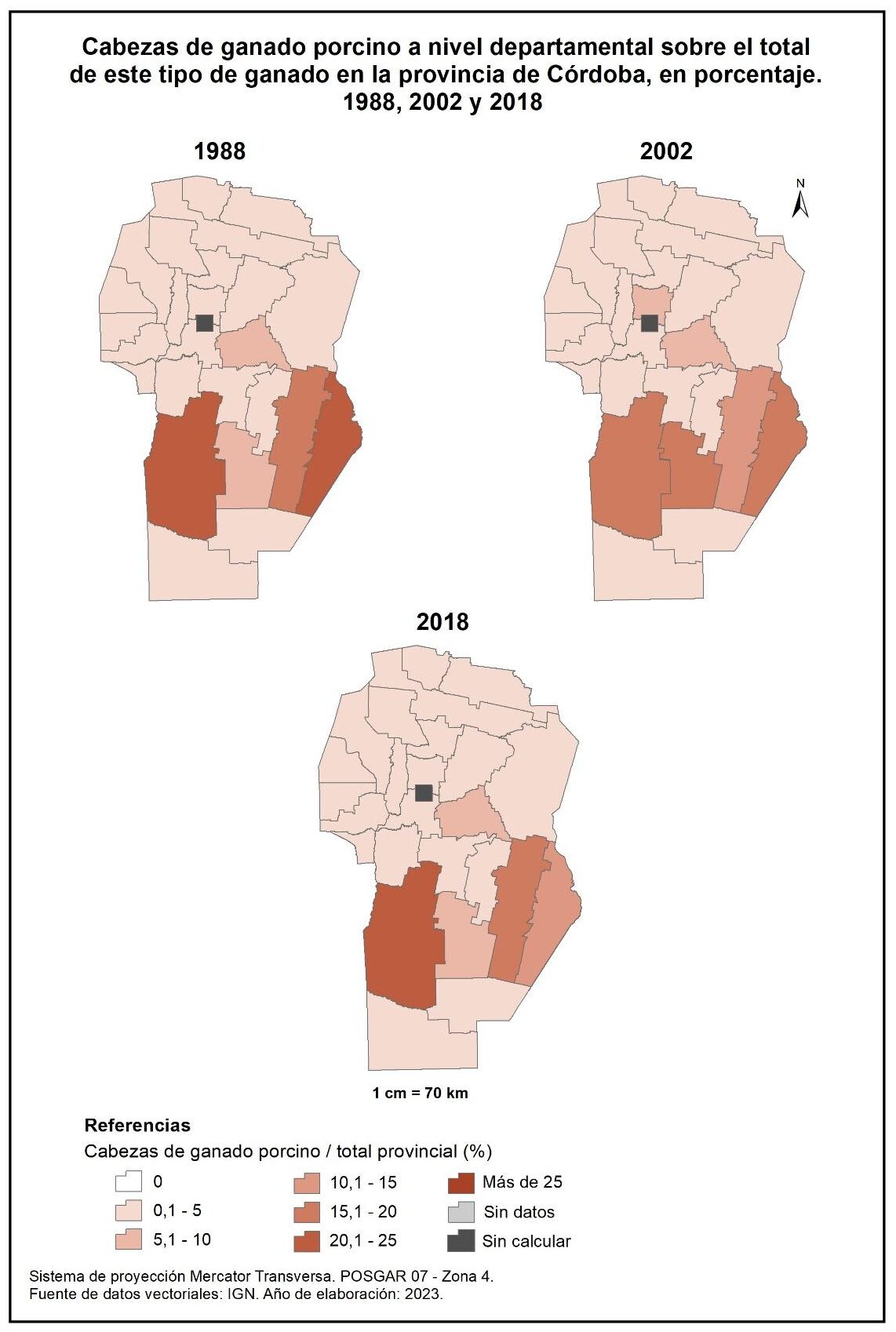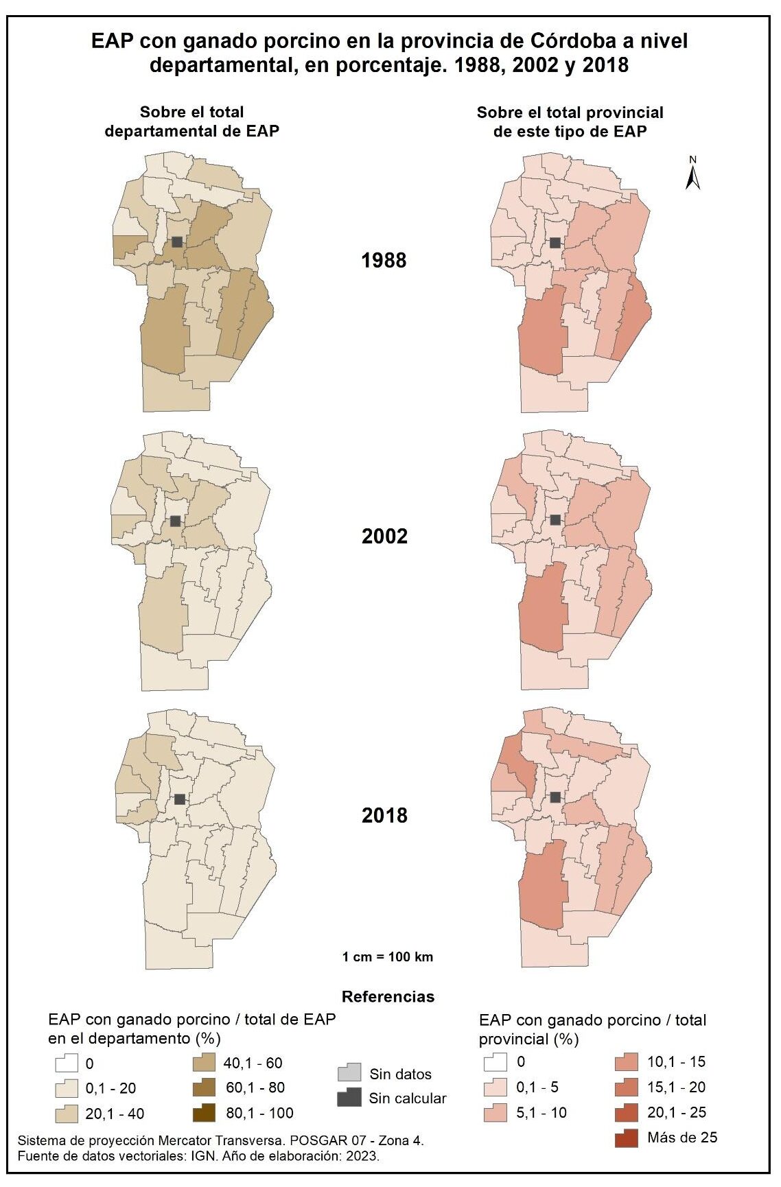 Figura 4.17. EAP con ganado porcino en la provincia de Córdoba a nivel departamental, en porcentaje. Años 1988, 2002 y 2018.