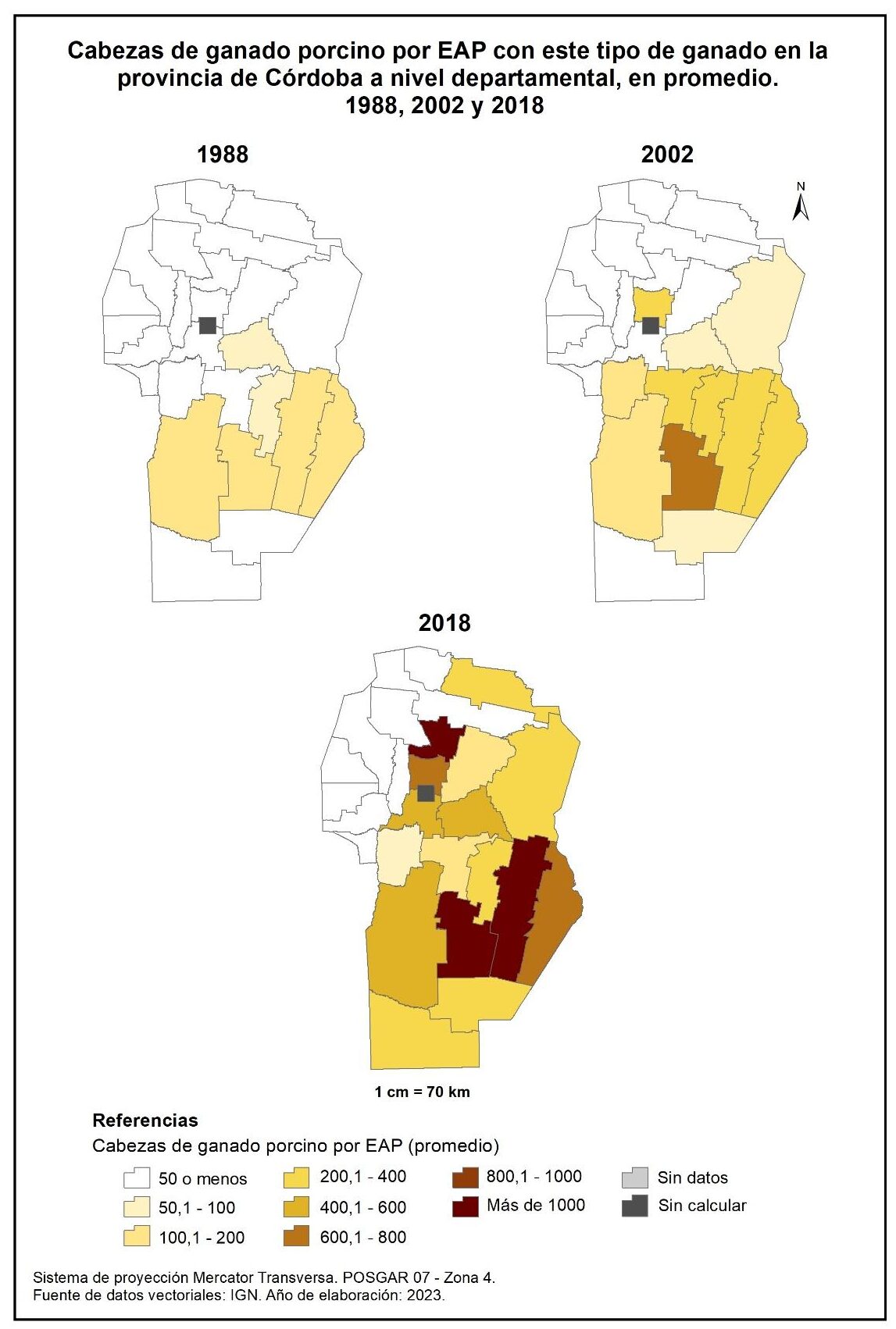 Figura 4.19. Cabezas de ganado porcino por EAP con este tipo de ganado en la provincia de Córdoba a nivel departamental, en promedio. Años 1988, 2002 y 2018.