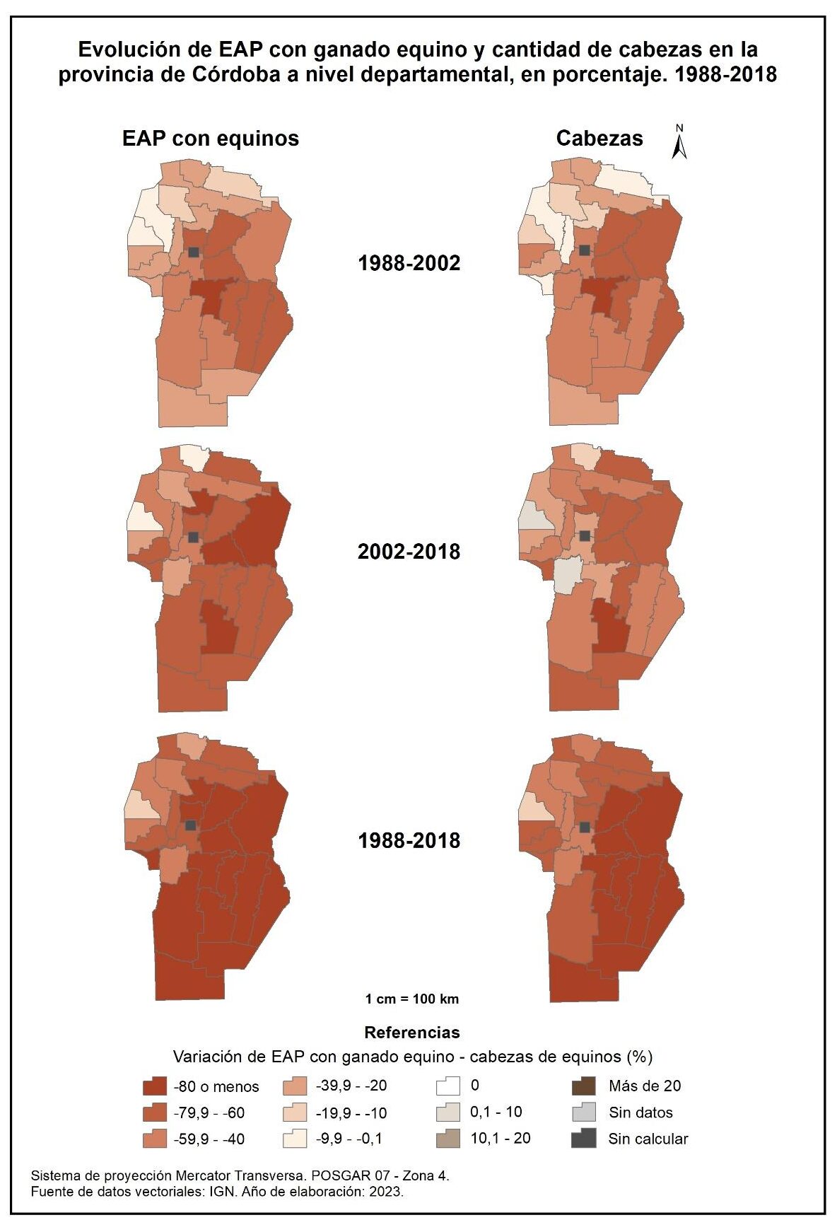 En cuanto al corte temporal total (1988-2018) son mayormente los departamentos del centro, este y sur los que evidencian una disminución más marcada en la cantidad de cabezas equinas, en torno al -80% o menos. En tanto que la zona oeste y norte de la provincia registra reducciones menores, en general en el rango de -0,1 a -60%.