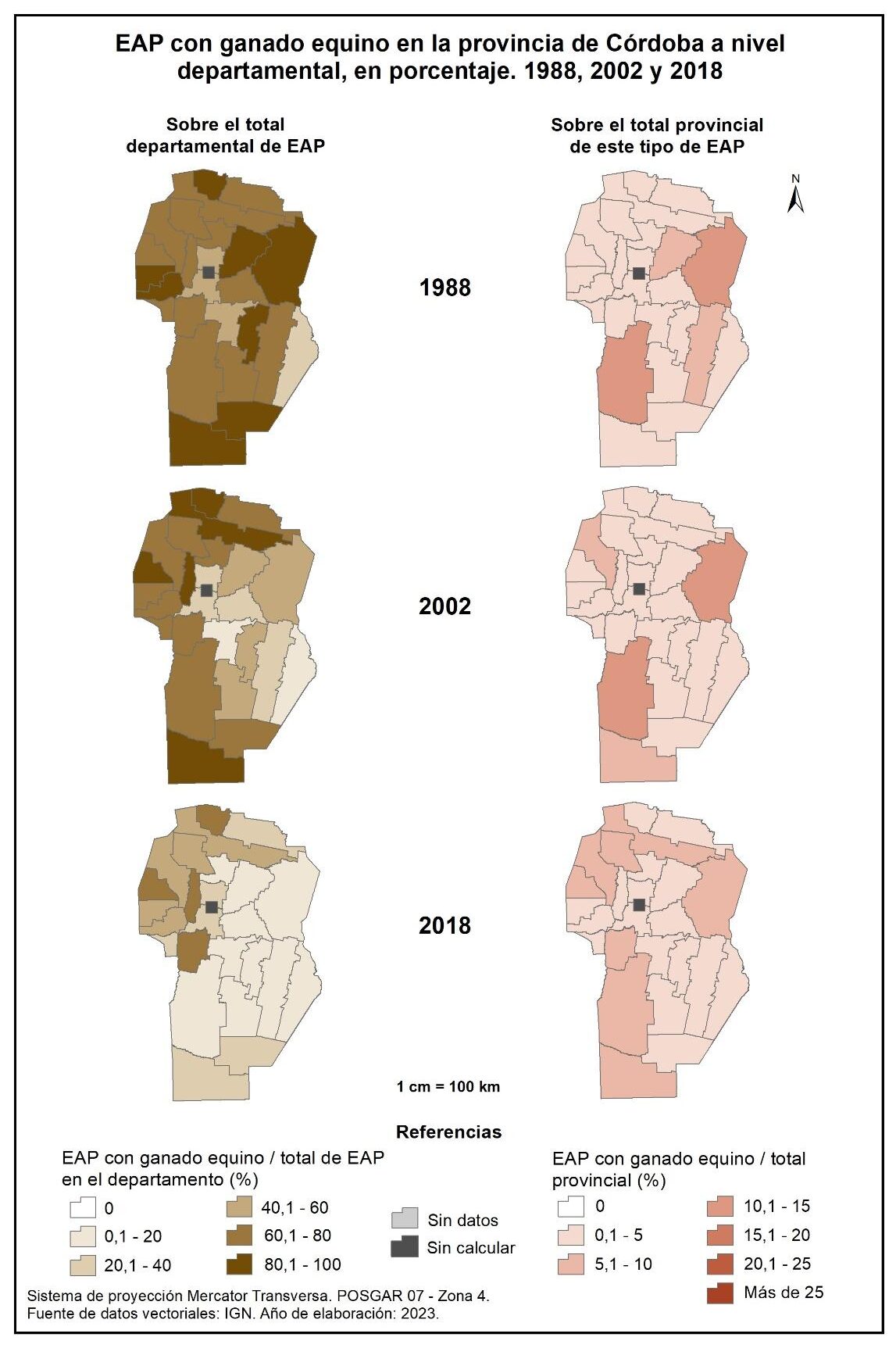 Figura 4.22. EAP con ganado equino en la provincia de Córdoba a nivel departamental, en porcentaje. Años 1988, 2002 y 2018.
