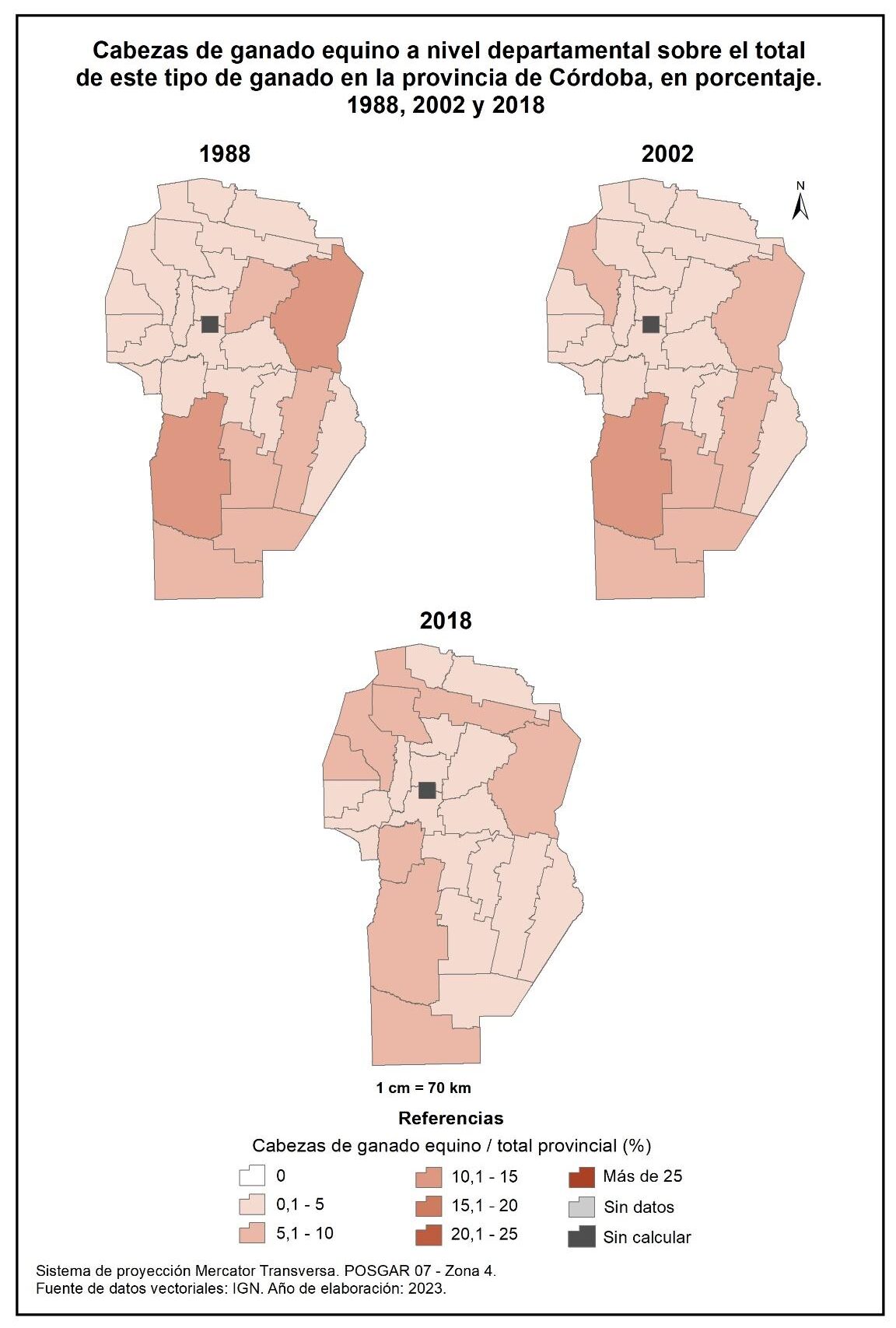 Figura 4.23. Cabezas de ganado equino a nivel departamental sobre el total de este tipo de ganado en la provincia de Córdoba, en porcentaje Años 1988, 2002 y 2018.