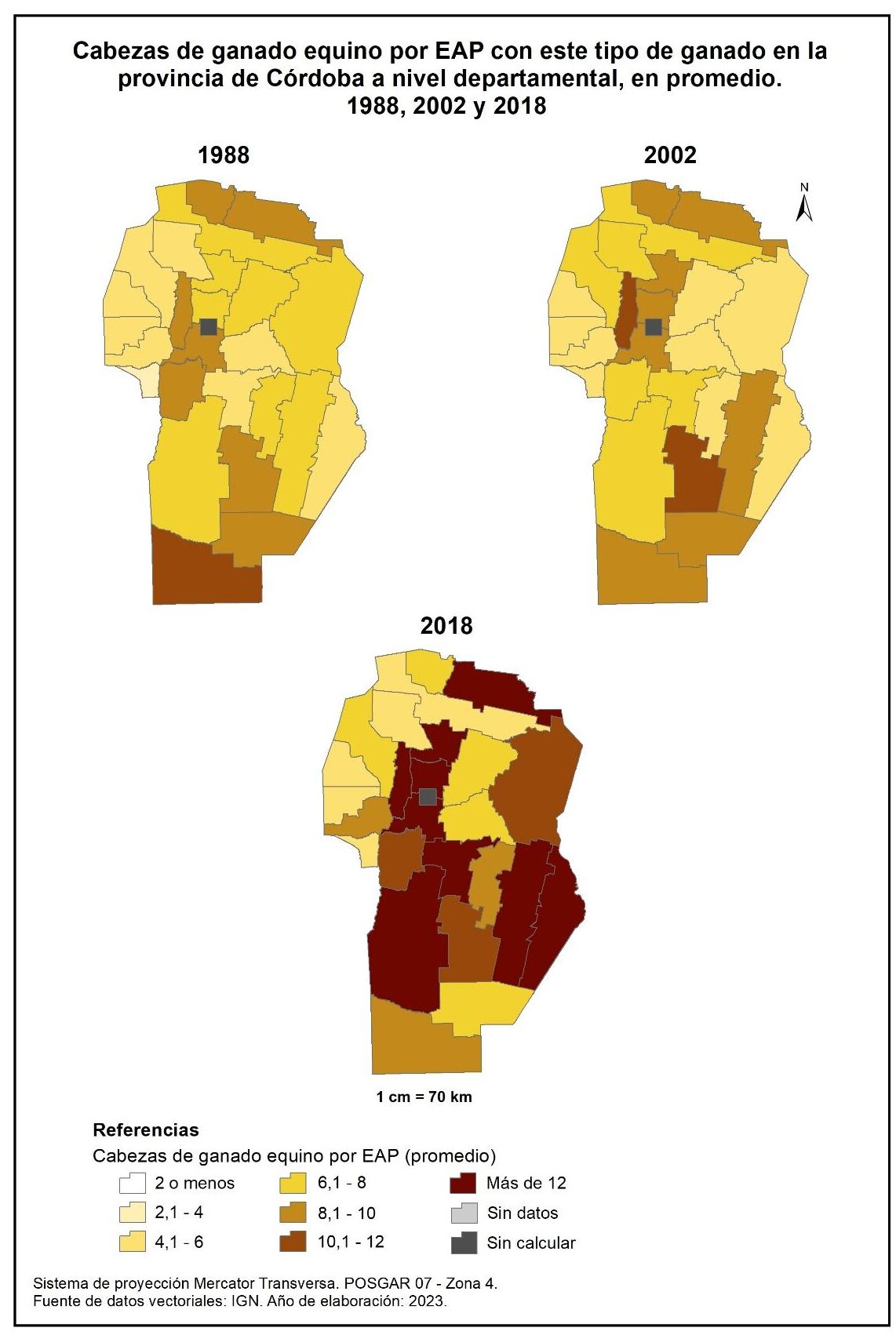 Figura 4.24. Cabezas de ganado equino por EAP con este tipo de ganado en la provincia de Córdoba a nivel departamental, en promedio. Años 1988, 2002 y 2018.