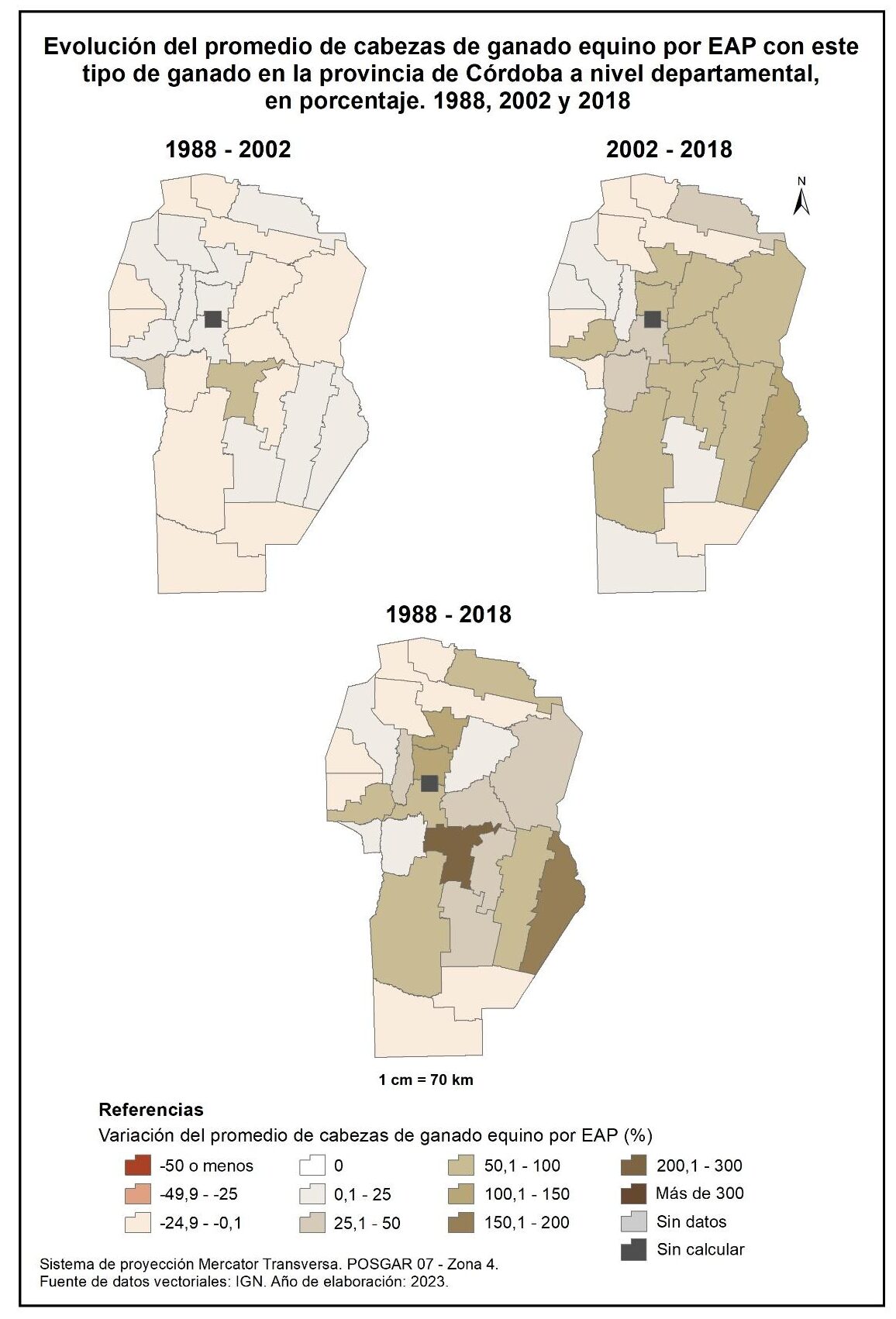 Figura 4.25. Evolución del promedio de cabezas de ganado equino por EAP con este tipo de ganado en la provincia de Córdoba a nivel departamental, en porcentaje. Años 1988, 2002 y 2018.