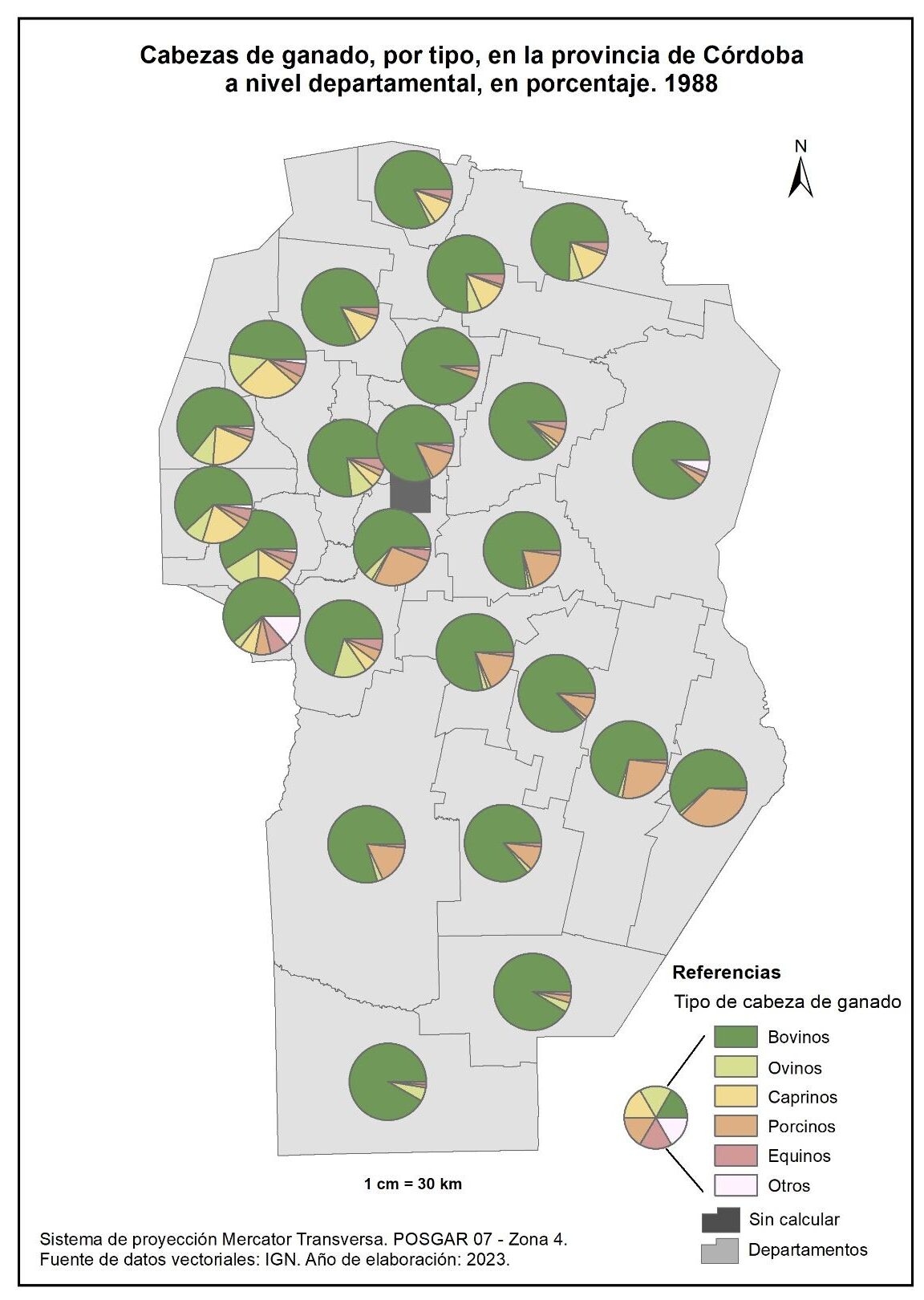 Figura 4.26. Cabezas de ganado, por tipo, en la provincia de Córdoba a nivel departamental, en porcentaje. Año 1988.