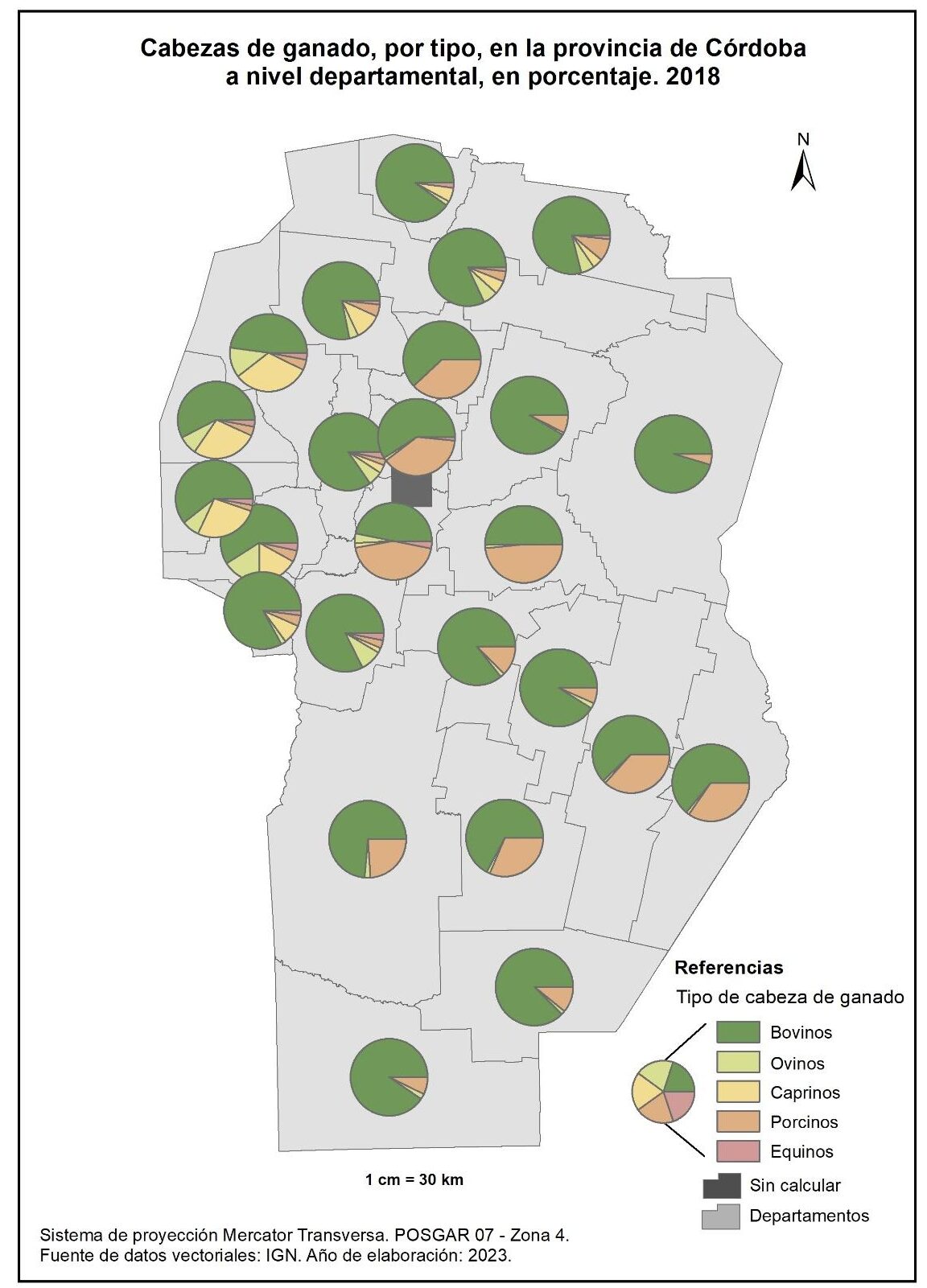 Figura 4.28. Cabezas de ganado, por tipo, en la provincia de Córdoba a nivel departamental, en porcentaje. Año 2018.