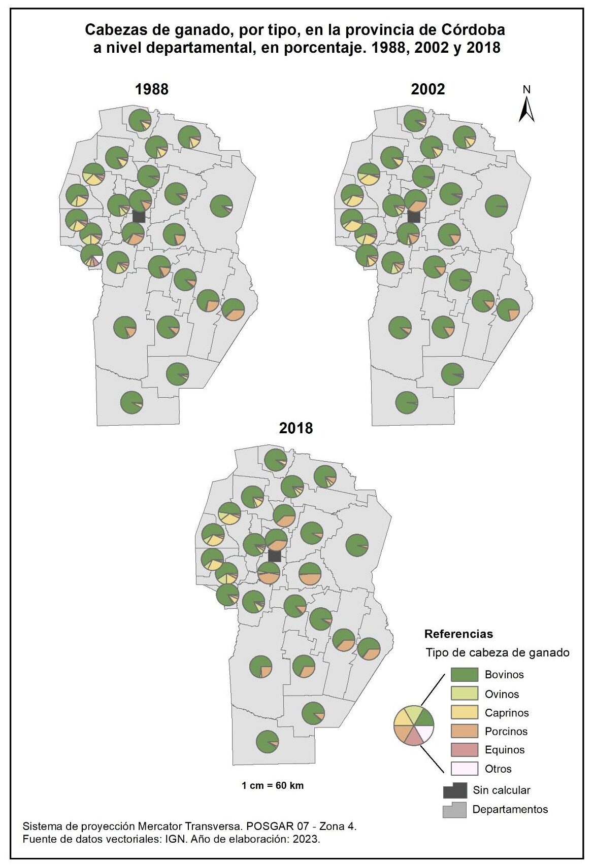 Figura 4.29. Cabezas de ganado, por tipo, en la provincia de Córdoba a nivel departamental, en porcentaje. Años 1988, 2002 y 2018.
