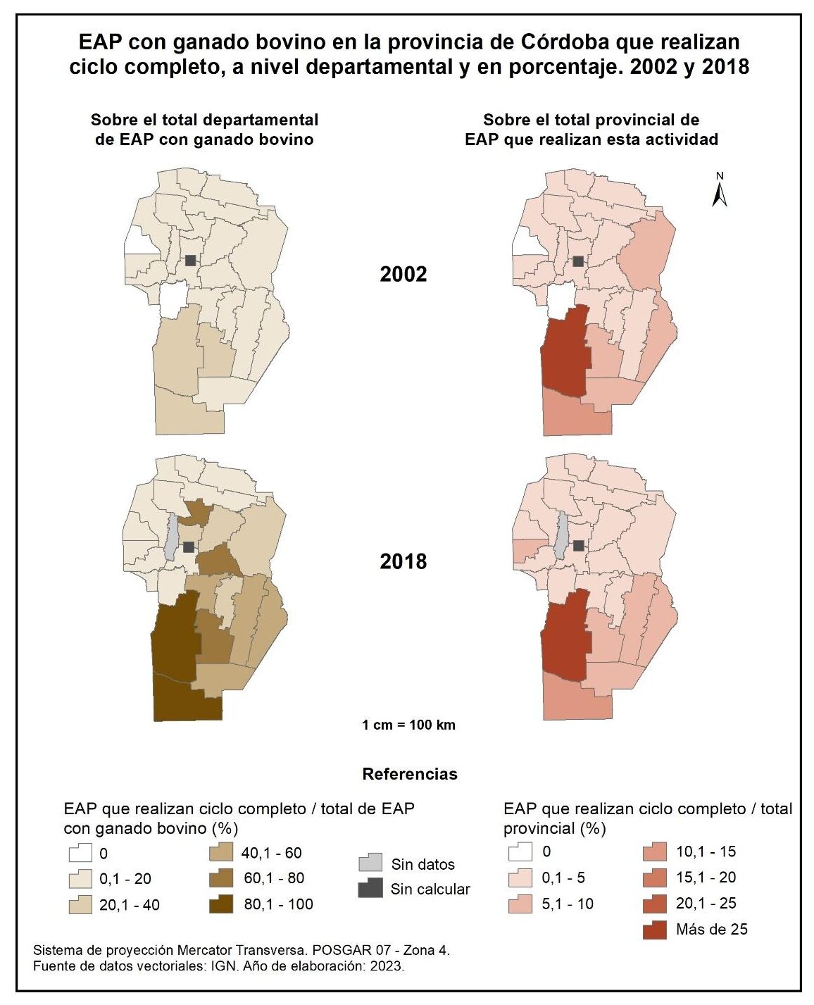 Figura 4.34. EAP con ganado bovino en la provincia de Córdoba que realizan ciclo completo, a nivel departamental y en porcentaje. Años 2002 y 2018.