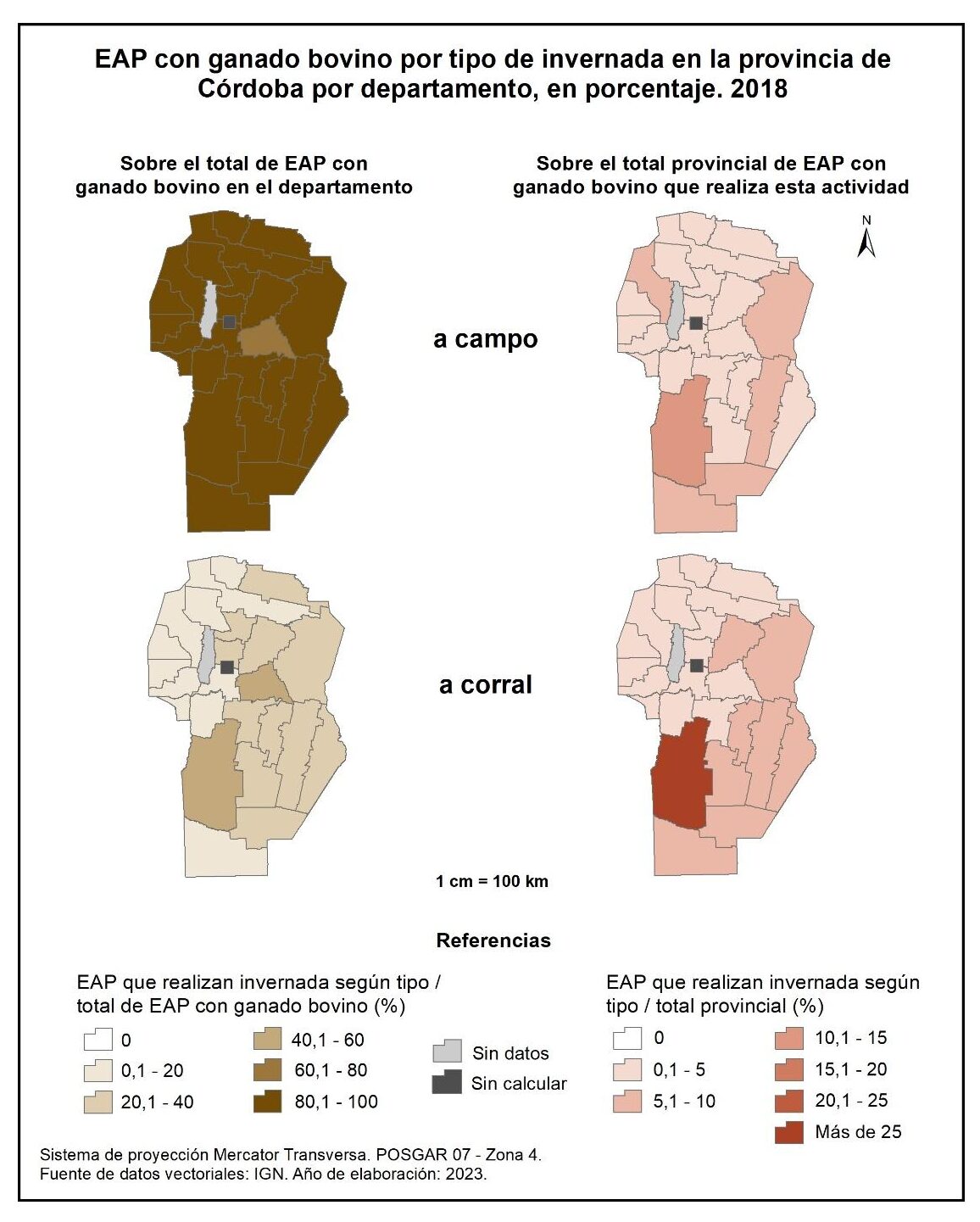 Las EAP con orientación productiva de invernada a campo sobre el total de EAP con ganado bovino en el departamento para el año 2018 (figura 4.35, columna izquierda) registran una participación superior al 80% en casi toda la provincia, a excepción de Río Segundo con el 72% y de Punilla, para el cual no hay datos. Por su parte, las EAP con invernada a corral detentan una participación considerablemente menor, sobre todo en los departamentos del norte y oeste, que no supera el 20%. En tanto que los departamentos del centro, sur y este presentan porcentajes de entre el 20 y 40%, mientras que Río Cuarto y Río Segundo destacan con el 41%.
