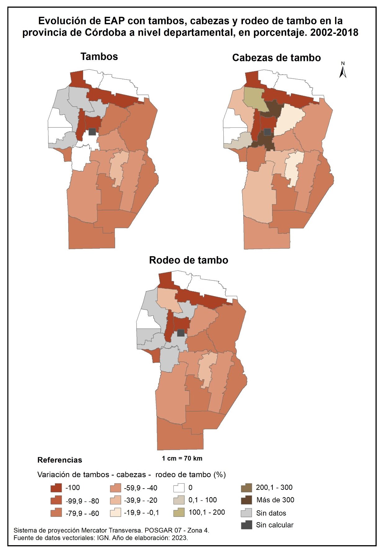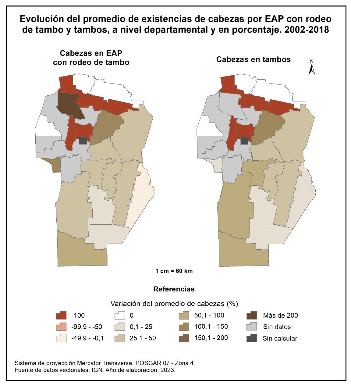 En cuanto al segundo período (2002-2018), se evidencia un leve aumento de los promedios de cabezas bovinas por EAP; Punilla sobresale con más de 300%. En tanto que en los departamentos de Tulumba, Ischilín, Pocho, Presidente Roque Sáenz Peña, Juárez Celman y General Roca el promedio disminuye en torno a un -10%.