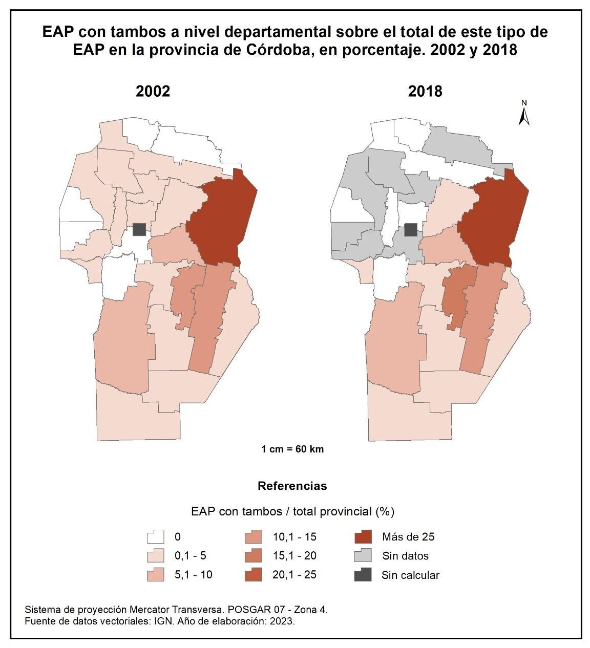 Figura 4.39. EAP con rodeo de tambo en la provincia de Córdoba a nivel departamental, en porcentaje. Años 2002 y 2018.