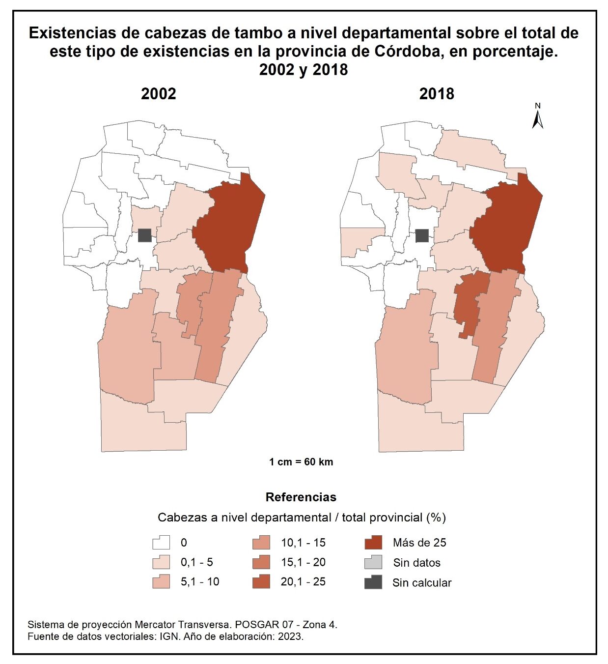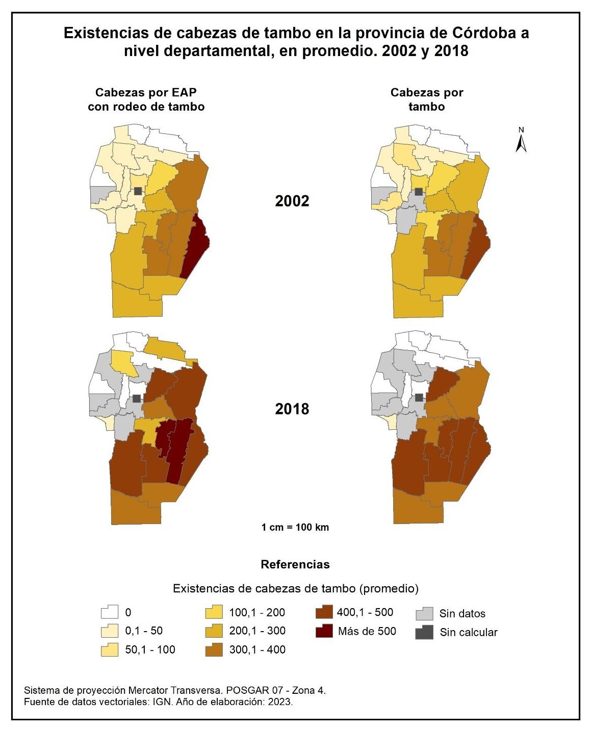 Figura 4.40. Existencias de cabezas de tambo en la provincia de Córdoba a nivel departamental, en promedio. Años 2002 y 2018.