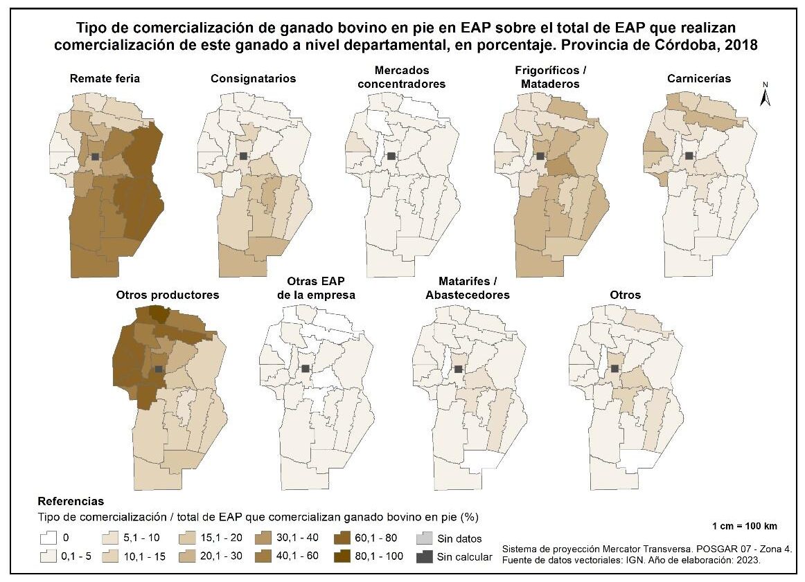 En este subapartado se presentan los resultados correspondientes a la comercialización del ganado bovino en pie en la provincia de Córdoba. Se compone de tres mapas con sus respectivos análisis que recuperan, para el año 2018, la participación relativa de cada canal de comercialización identificada: remate en feria, consignatario, mercado concentrador, frigorífico y/o matadero, carnicería, otros productores, otras explotaciones de la empresa, matarifes y/o abastecedores, otros.