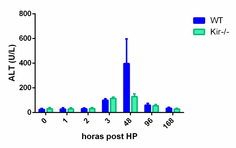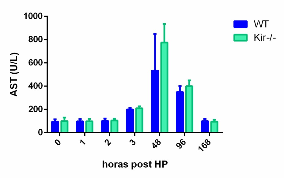 FIGURA 3. Perfil de actividad enzimática de las transaminasas AST y ALT en suero de ratones WT y Kir-/- a diferentes tiempos post HP. Los resultados se expresan como media ± SEM (n= 3-4 ratones por condición).