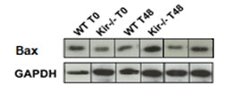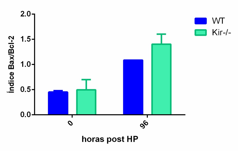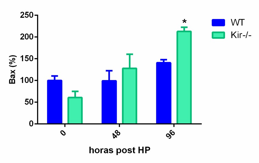 La determinación de Bax arrojó resultados más interesantes, ya que se observó un patrón de aumento de dicha proteína que comenzó a las 48 h en la cepa Kir6.2, y se hizo significativamente mayor a las 96 h post cirugía en comparación con los ratones WT.