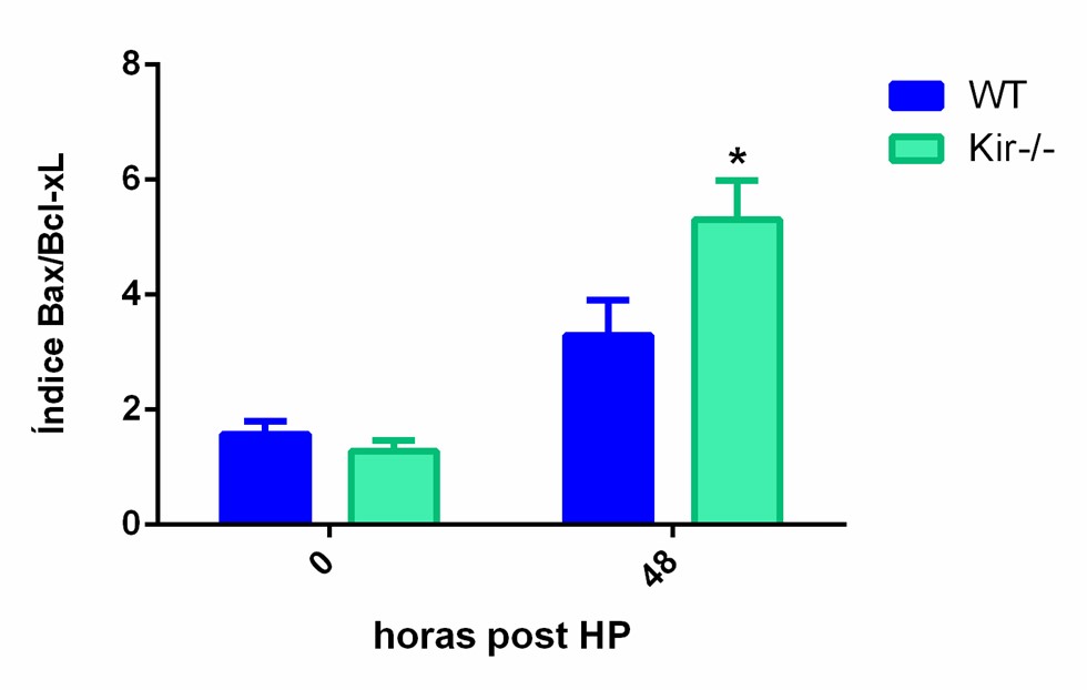 FIGURA 9. Índice apoptótico determinado en muestras de hígado de ratones de la cepa C57/BL6 (WT) y Kir6.2-/- (Kir -/-) a las 0, 48 y 96 h post HP. El índice apoptótico fue calculado como el cociente entre la proteína proapoptotica Bax y las proteínas antiapoptoticas Bcl-2/Bcl-xL. Las barras representan la media ± SEM (n=3 por condición) *p<0.05 vs su correspondiente WT para cada tiempo.