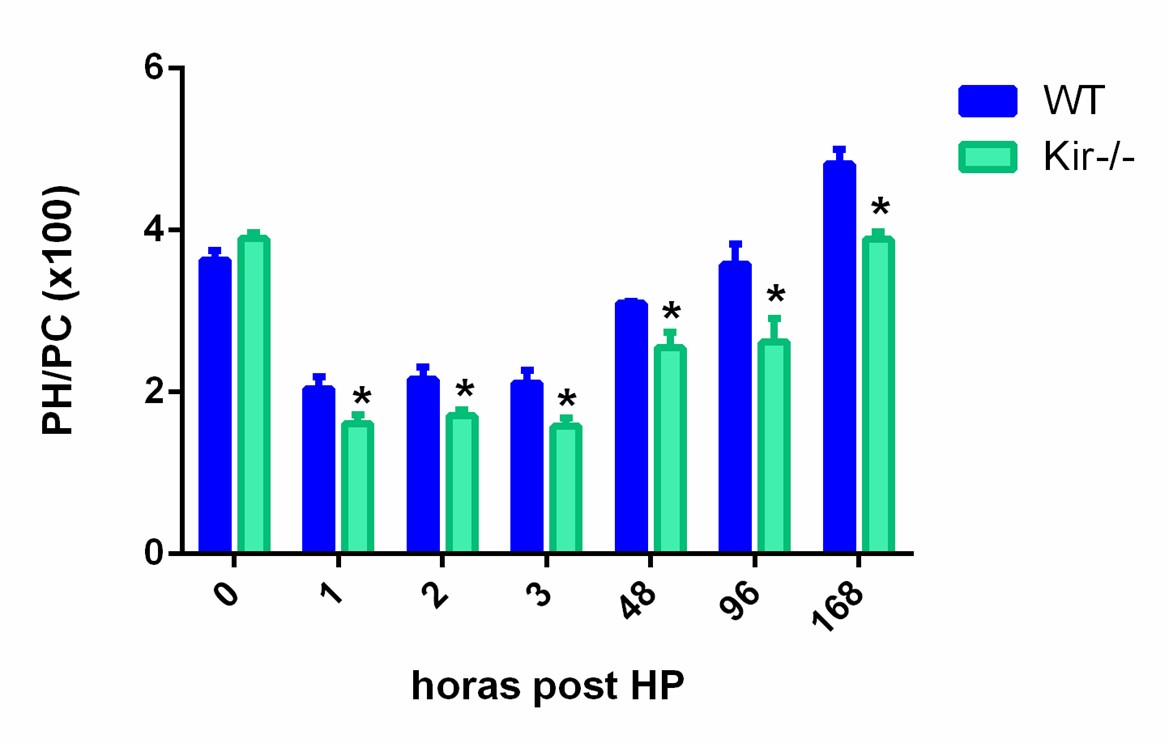 La figura 4 muestra el índice PH/PC a 0, 1, 2, 3, 48, 96 y 168 h posteriores a una HP, en ratones controles y carentes de la proteína Kir6.2. Como se observa en la figura, a todos los tiempos post HP estudiados hay una diferencia significativa en el índice entre los animales WT y los Kir-/-, estos últimos mostrando un índice considerablemente menor.
