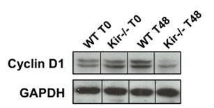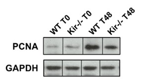Para obtener una medida cuantitativa del estado proliferativo disminuido en los hígados regenerantes de los ratones Kir-/-, analizamos por Western Blot los niveles proteicos de PCNA y de ciclina D1. La ciclina D1 es una proteína clave para el ingreso de las células al ciclo celular y su posterior progresión a través de él (Albrecht JH, Poon RY, Ahonen CL, Rieland BM, Deng C, & Crary GS, 1998).