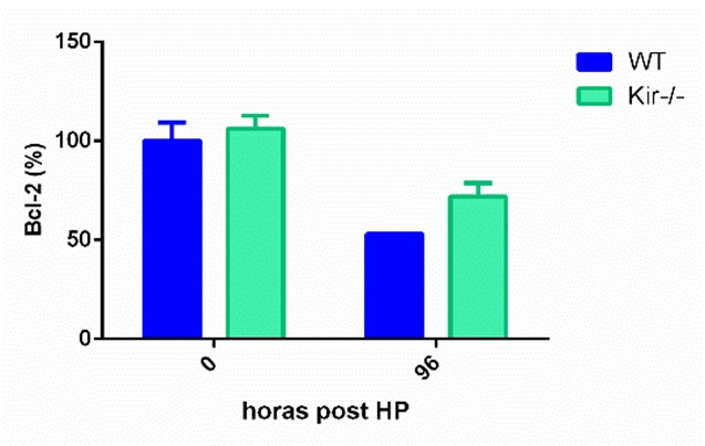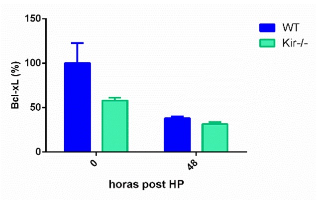 En cuanto a las proteínas antiapoptóticas, se determinó Bcl-xL a las 48 h post HP, mientras que Bcl-2 se midió a las 96 h post cirugía. Como era de esperar, en los animales control, los niveles de estas proteínas disminuyeron a estos dos tiempos con respecto a sus niveles basales. Cuando se compararon los niveles las proteínas en el grupo Kir-/- con respecto al grupo WT, ninguna de las dos proteínas antiapoptóticas mostró diferencias significativas entre las cepas. Bcl-xL mostró una tendencia a estar disminuida fundamentalmente al momento de la HP en los ratones Kir-/-, mientras que Bcl-2 mostró una tendencia a aumentar a las 96 h en la misma cepa (figura 8).