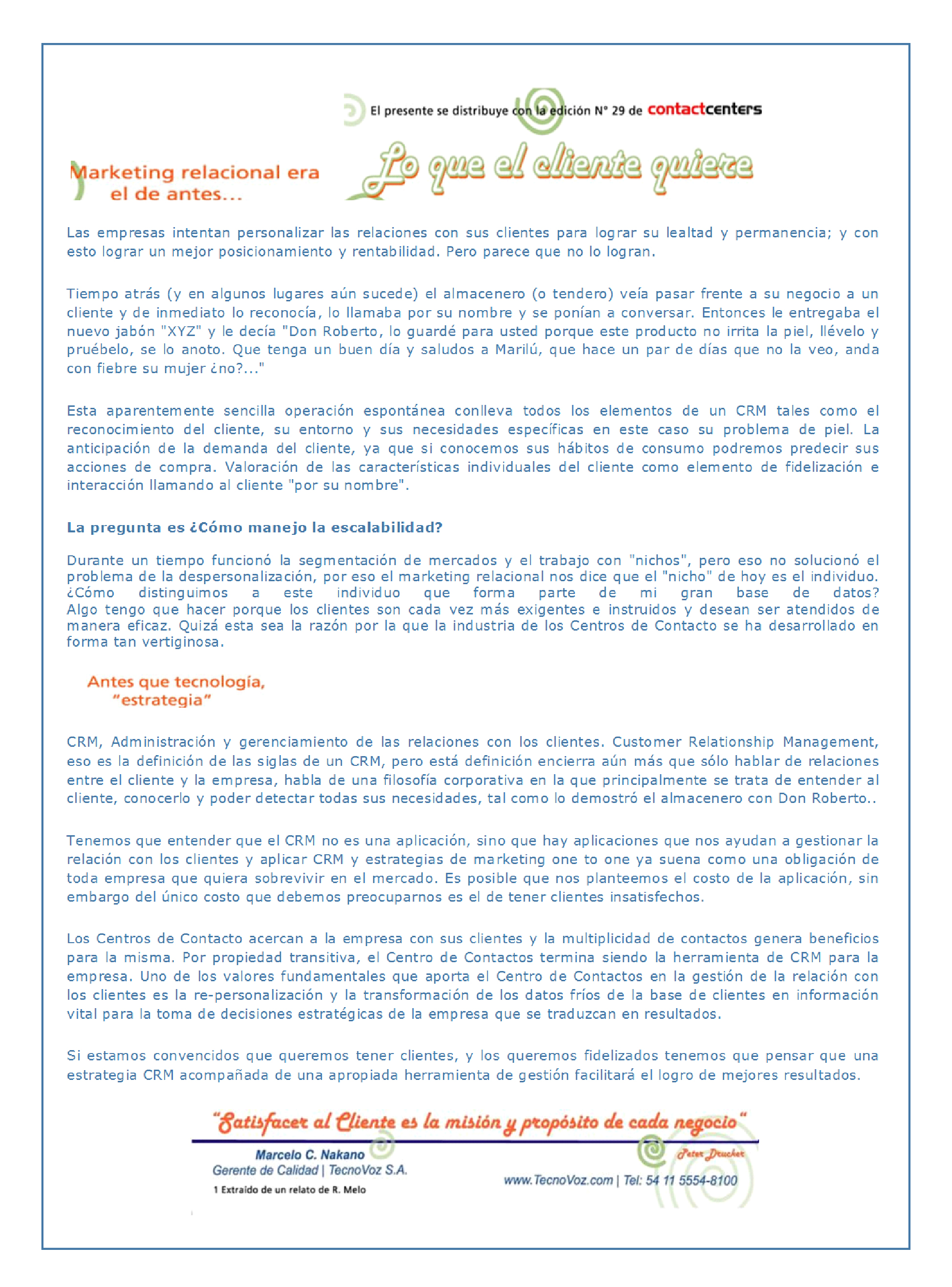 - No podemos afirmar que haya una autonomía y producción propia de los CCs sobre estos saberes. Más bien toman teorizaciones de autores vinculados al marketing, sobre los que vuelven una y otra vez en todos estos años (en el documento mostrado, la frase final del texto pertenece a Peter Drucker, principal académico de la administración empresarial, quien ya la escribía, por ejemplo, en el libro Management: tasks, responsabilities, practices del año 1973. Luego la reproduce en su blog un consultor empresarial de apellido Melo en el año 2005. Finalmente en el año 2008 la reproduce con algunas modificaciones y le otorga mayor difusión para los CCs la revista Contact Center). ↵