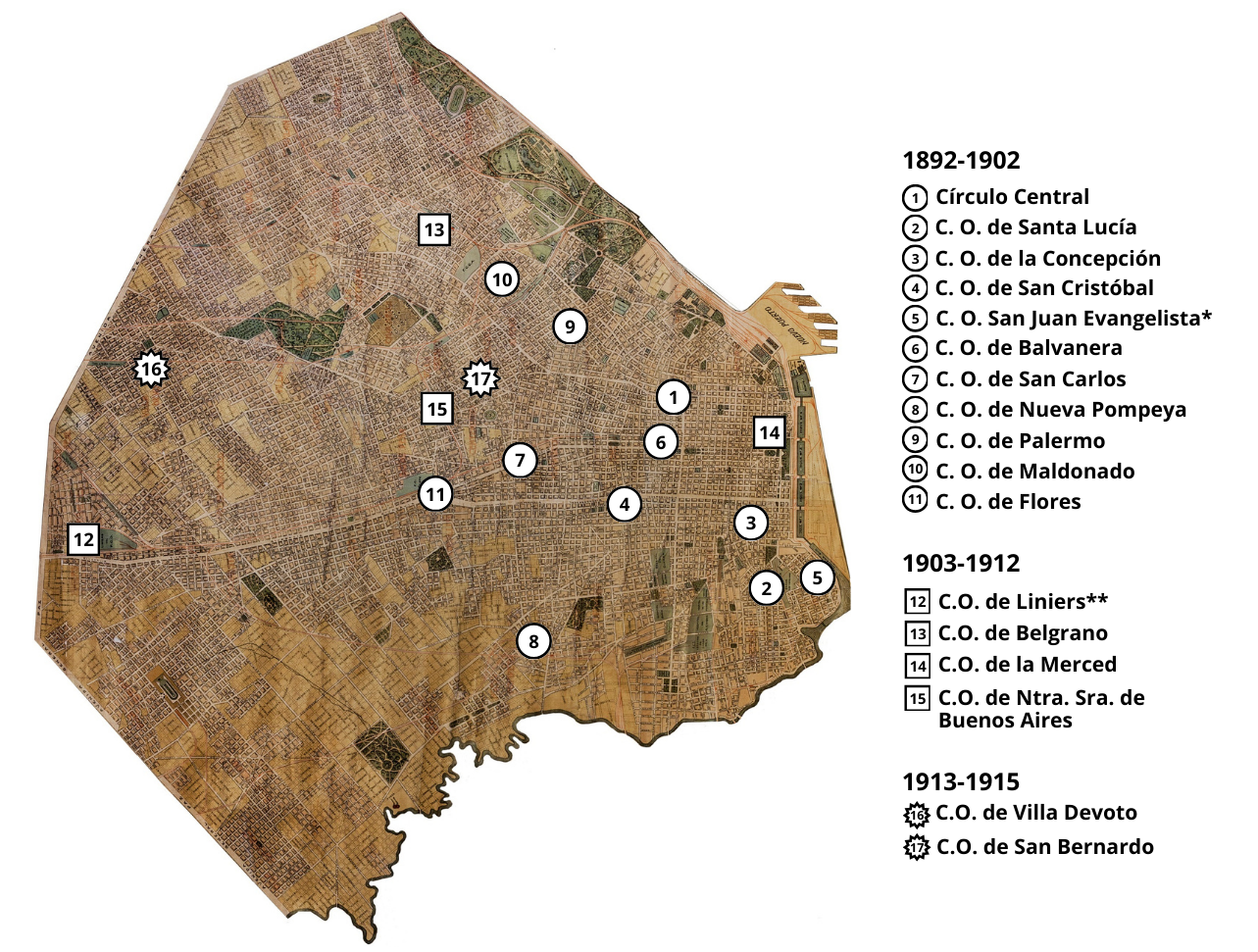 Fundados todavía bajo los efectos de la crisis económica de 1890, los círculos de obreros creados para auxiliar a los trabajadores varones en sus necesidades inmediatas les brindaron un espacio de sociabilidad e instrucción católicas del que se los consideraba especialmente distanciados. A diferencia de las asociaciones previas –como, por ejemplo, las conferencias de San Vicente de Paul–, incorporaban a los trabajadores como socios y tomaban la forma de una asociación mutual. Como se puede ver en el gráfico de la página siguiente, su amplio despliegue territorial en la ciudad de Buenos Aires significó que estuvieran distribuidos en casi todas las parroquias del municipio.[7] El Círculo Central, por ejemplo, se ubicó en lo que conocemos hoy como Barrio Norte –inicialmente en las cercanías de la vieja estación del Parque, luego se mudó más cerca de Santa Fe y Callao y, finalmente, levantó su sede definitiva en la calle Junín al 1000–. El Círculo de Obreros de Santa Lucía, fundado en 1894 en el barrio de Barracas, fue el primero en tener su local propio. Ese año se fundaron otros tres círculos: el de la Concepción, que tuvo varias locaciones en los actuales barrios de Monserrat y Constitución; el de San Cristóbal que funcionó en distintas direcciones en el barrio homónimo y el de Balvanera que encontró sus espacios de funcionamiento en las cercanías de la iglesia parroquial, ubicada en Mitre y Azcuénaga. Al año siguiente, en 1895, hizo su aparición el Círculo de Obreros de San Juan Evangelista en el barrio de la Boca y el Círculo de Obreros de San Carlos se creó en 1896 en el barrio de Almagro. El Círculo de Obreros de Nueva Pompeya, creado en 1899, encontró rápidamente su locación a la vuelta de la iglesia parroquial por la calle Esquiú, mientras el Círculo de Obreros de San José de Flores lo hizo en las proximidades de la Plaza Flores en 1900 y ese mismo año hizo lo propio el de Palermo en la zona de Plaza Italia. En San Telmo, se creó en 1901 el círculo que llevaba ese nombre y, un año después, en las cercanías de Santa Fe y Dorrego, se conformó el Círculo de Obreros de Maldonado. En 1905, se inauguraron tres círculos: el de Belgrano, que se ubicó en Amenábar a unas cuadras de Juramento y que más adelante mudó sus trabajos al Bajo Belgrano; el de Vélez Sarsfield y el de Liniers, ambos en la zona oeste de la ciudad. A cuadras del monumento al Cid Campeador, en 1906, se organizó el Círculo de Obreros de Nuestra Señora de Buenos Aires y un año después en el microcentro porteño se inauguró el Círculo de Obreros de la Merced. En 1915, se fundaron dos Círculos más, uno en Villa Devoto y otro en la parroquia de San Bernardo, en Villa Crespo.