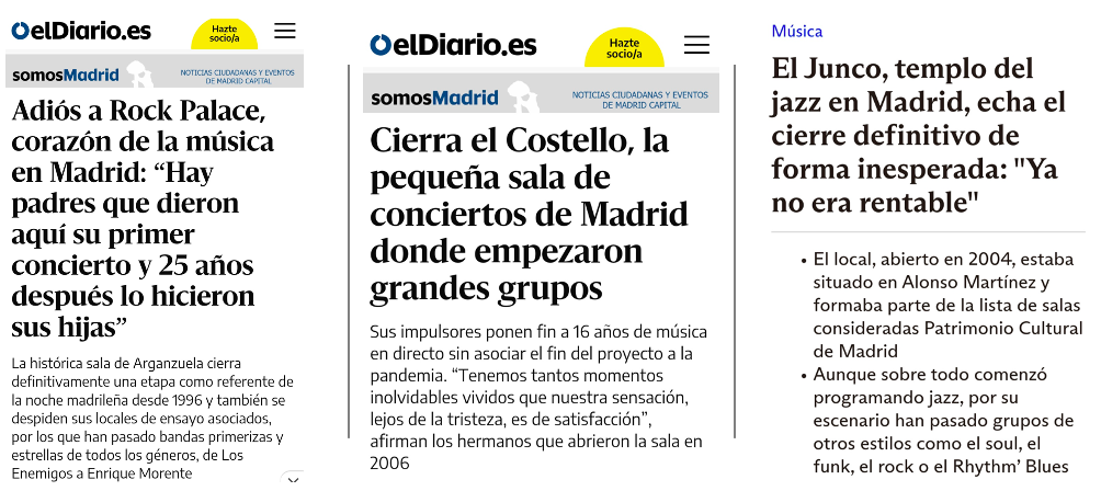 En los últimos cinco años se hace recurrente que medios de comunicación y redes sociales se hagan eco de noticias relativas al cierre de salas de concierto que todos los madrileños sentimos como nuestras haciendo alusión al final de una era: la muerte lenta de las salas de música en vivo, el tejido cultural en estado crítico, la oferta cultural se hunde (Madueño, 2022).