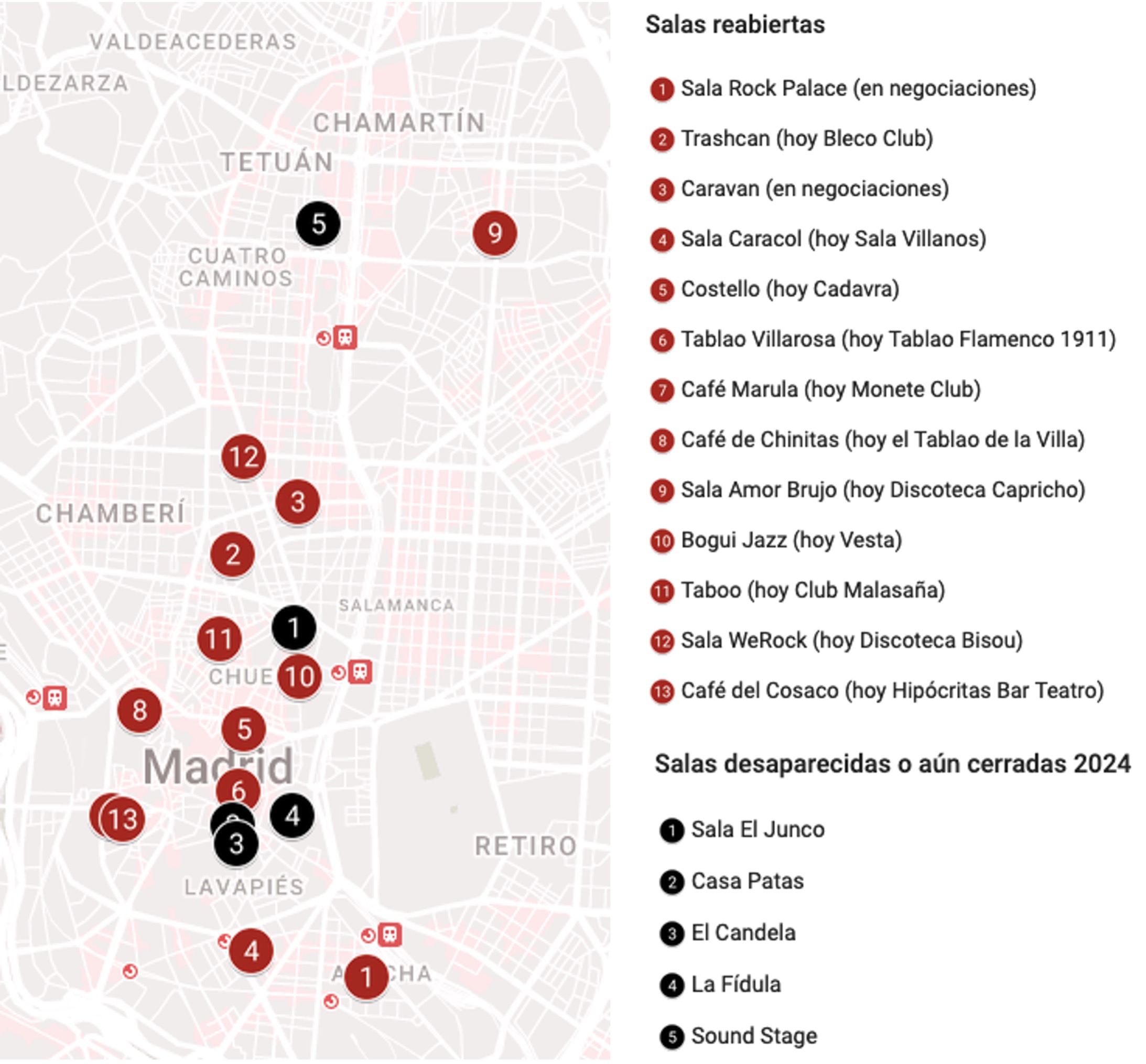 Se procede a continuación a mapear todas las salas clausuradas, vendidas o traspasadas en Madrid desde el año 2019, distinguiendo entre aquellas que continúan cerradas, y las que han reabierto. Tanto la sala Rock Palace como la sala Caravan se incluyen como salas reabiertas (aunque aún estén en fase de negociación). Este mapa ha sido elaborado con la aplicación Google My Maps (ver en este enlace).