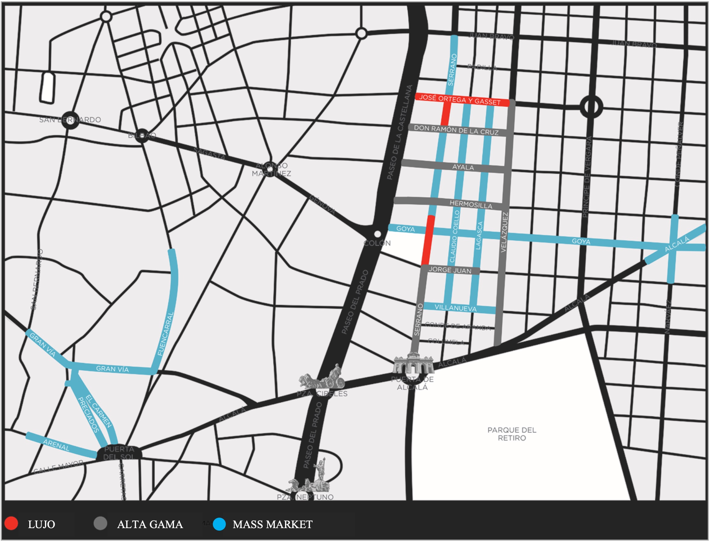 Figura 7. Principales ejes comerciales de Madrid: lujo, alta gama y mass market