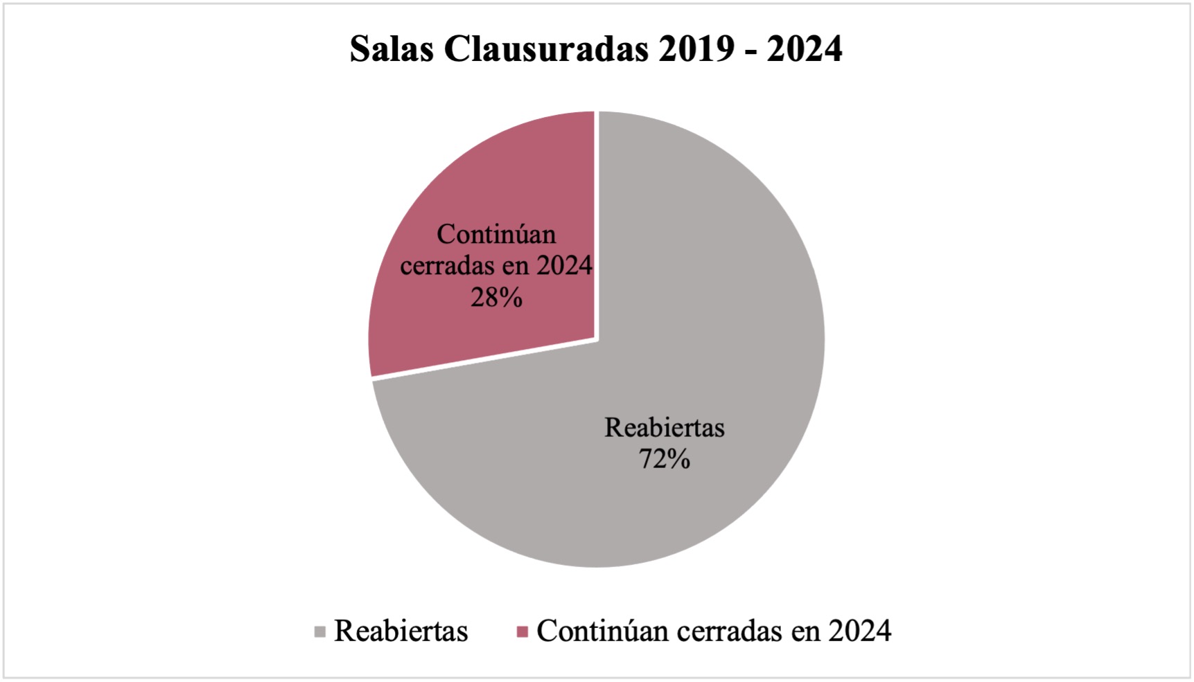 En base a los datos analizados se observa que el 28% (5 de 18) de las salas cerradas, no han reabierto ni se conocen planes de reapertura a corto plazo (se excluyen las salas Rock Palace y Caravan), sin embargo el restante 72% de salas ha reabierto con nuevos conceptos.