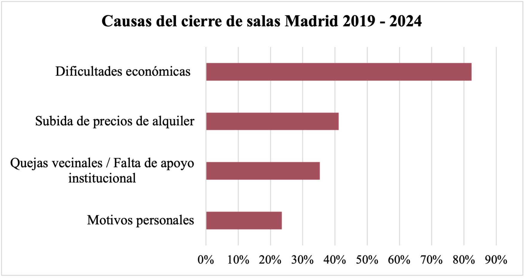 Se procede a continuación a analizar en detalle las principales causas de los cierres de las salas, o, para ser más exactos, los motivos que argumentan las salas de conciertos en un contexto en el que el sector de la música en vivo está en pleno proceso transformación: las dificultades económicas de las salas de conciertos, el incremento de los costes inmobiliarios y la reducción de la afluencia del público.