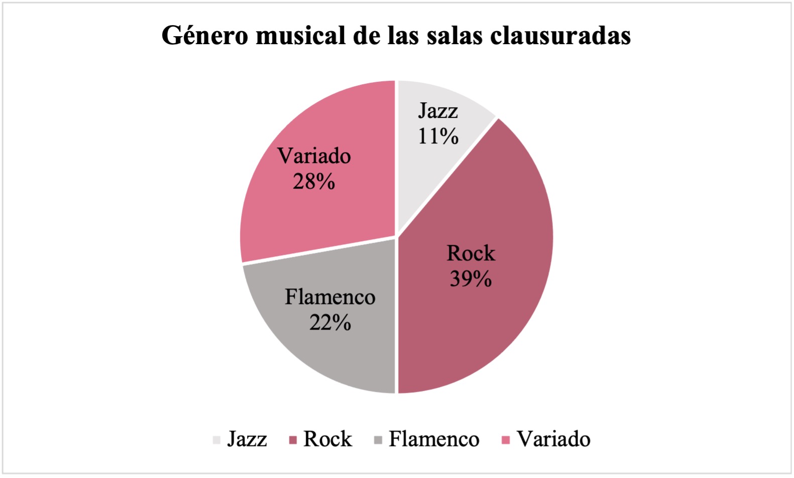 En cuanto al género musical preponderante de las salas clausuradas, se observa que las salas de rock son las más afectadas: 40% de las salas cerradas. Todas las salas de flamenco que cerrarron durante el periodo de pandemia 2020-2021, en el que el turismo sufrió un importante revés, han reabierto, y con fuerza, con el mismo género musical. Sin embargo, ninguna de las salas que programaban rock o jazz han vuelto a abrir programando mayoritariamente dichos estilos musicales.