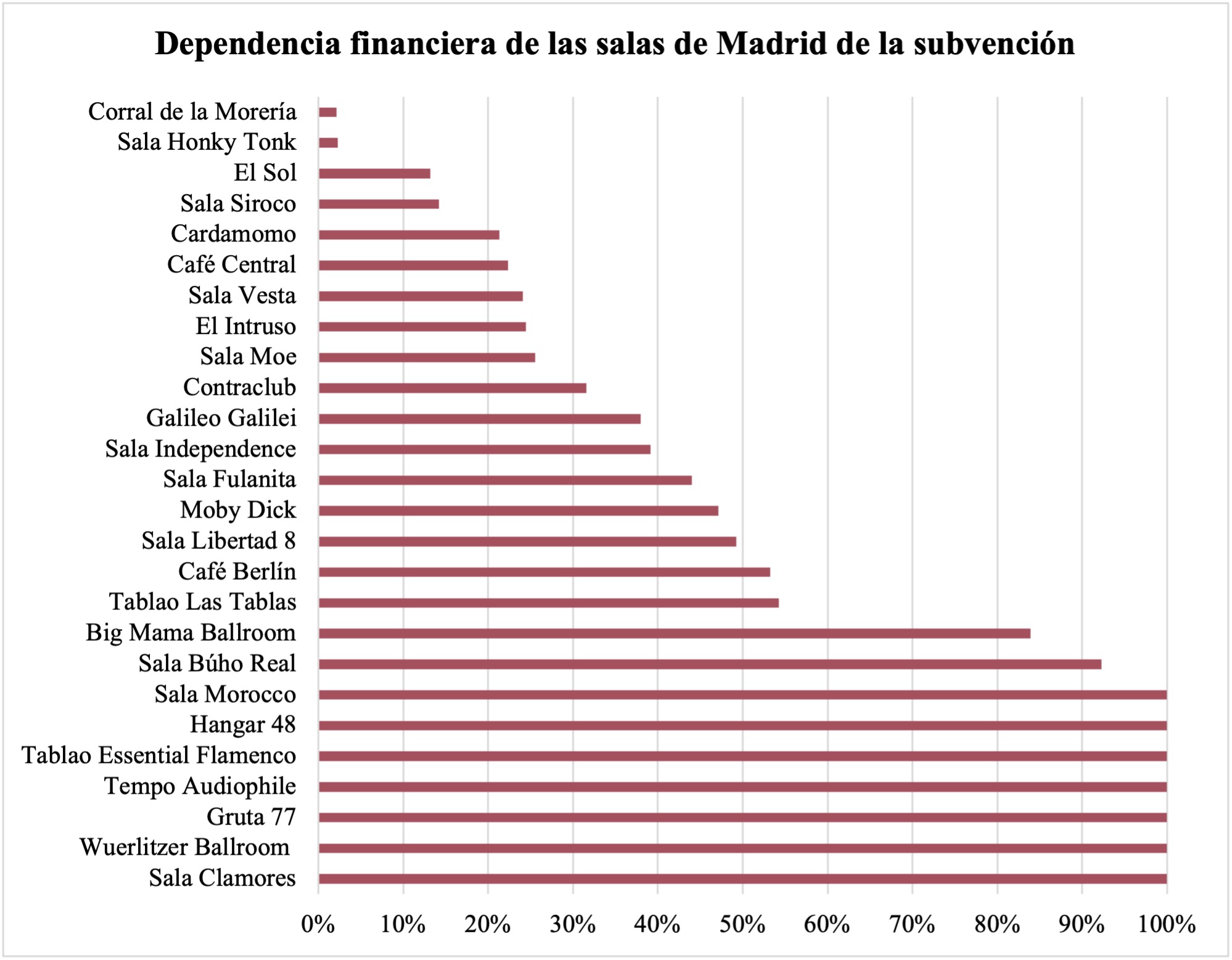 Las dos salas que tienen una menor dependencia de las subvenciones, o, dicho de otra forma, las más viables económicamente, son un tablao flamenco y una sala en cuya programación abundan las bandas de versiones o tributos. Y en el otro extremo, concluimos que, de no ser por las subvenciones, técnicamente, nueve de las 26 salas analizadas cerrarían sus puertas.
