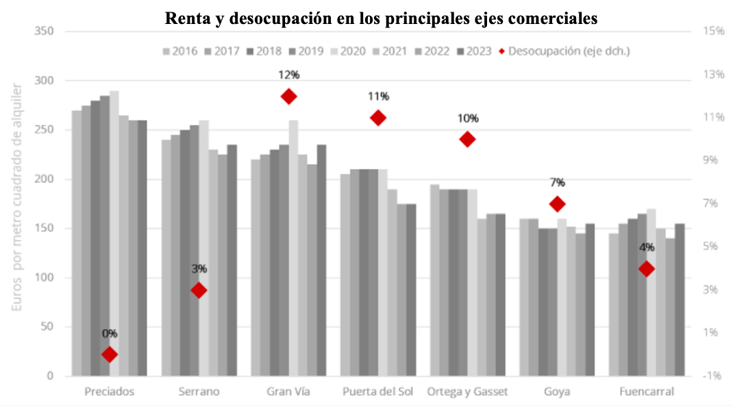 Las rentas de los locales comerciales se fijan en función de la superficie, la ubicación, de la competencia y de la demanda. En términos generales las rentas de los locales de la zona Centro – Preciados, Gran Vía, Puerta del Sol y Fuencarral – han descendido en últimos cuatro años fundamentalmente debido al auge de las ventas online aunque en la calle Preciados no existe ningún local disponible y en la calle Fuencarral la tasa de disponibilidad es de apenas el 4%.