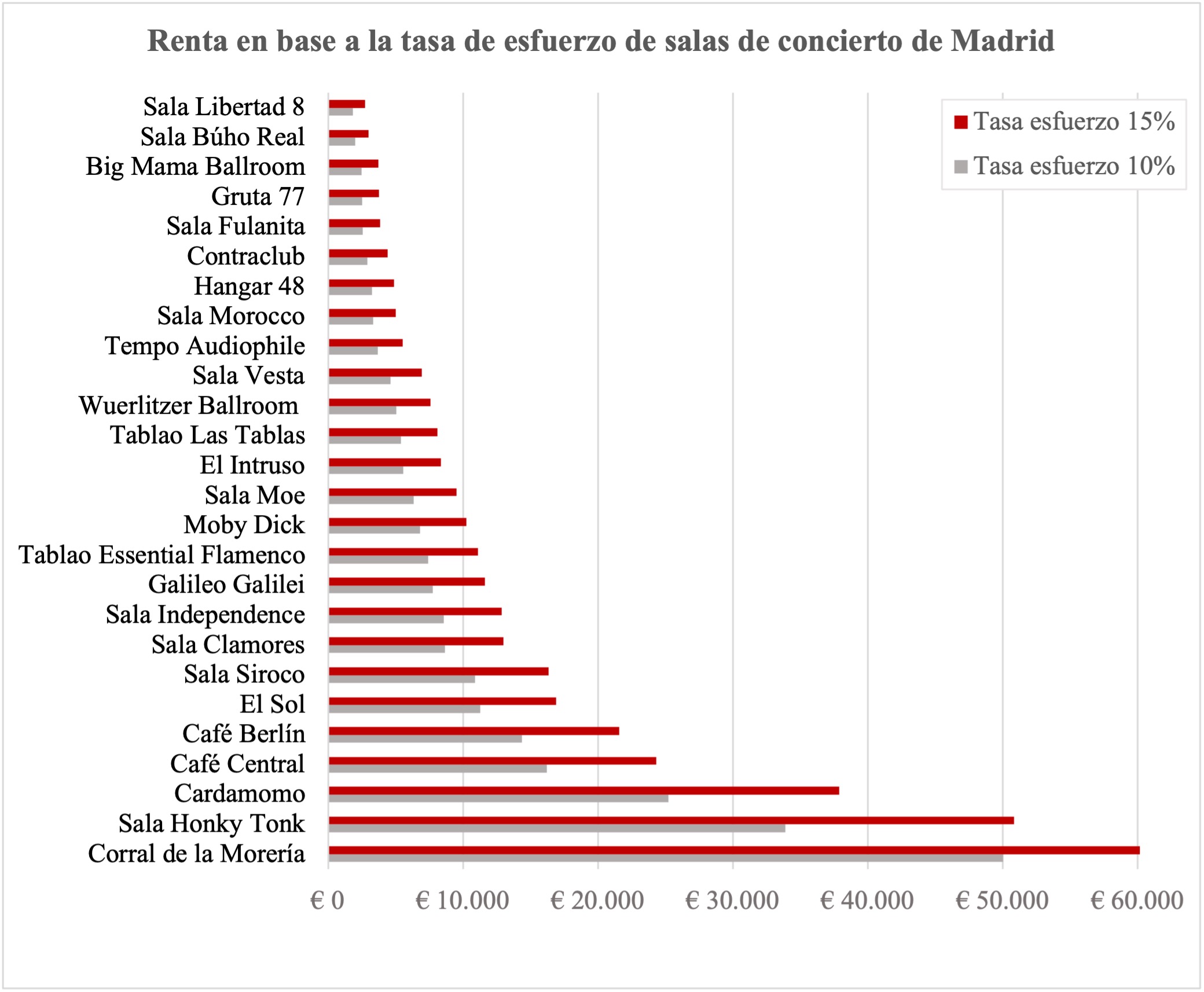 Del mercado de inversión inmobiliaria de locales y centros comerciales se extrae una métrica denominada tasa de esfuerzo que mide la proporción de ingresos destinados al pago del alquiler mensual, muy útil de cara a evaluar la viabilidad financiera de una sala de conciertos. Como regla general la tasa de esfuerzo o porcentaje de las ventas que se destinan a pagar el alquiler del local debería ser en torno al 10%, siendo el 25% el porcentaje máximo que de hecho refleja la inviabilidad del negocio. En resumidas cuentas, el alquiler del espacio no debe sobrepasar el 10-15% de la facturación de la sala.