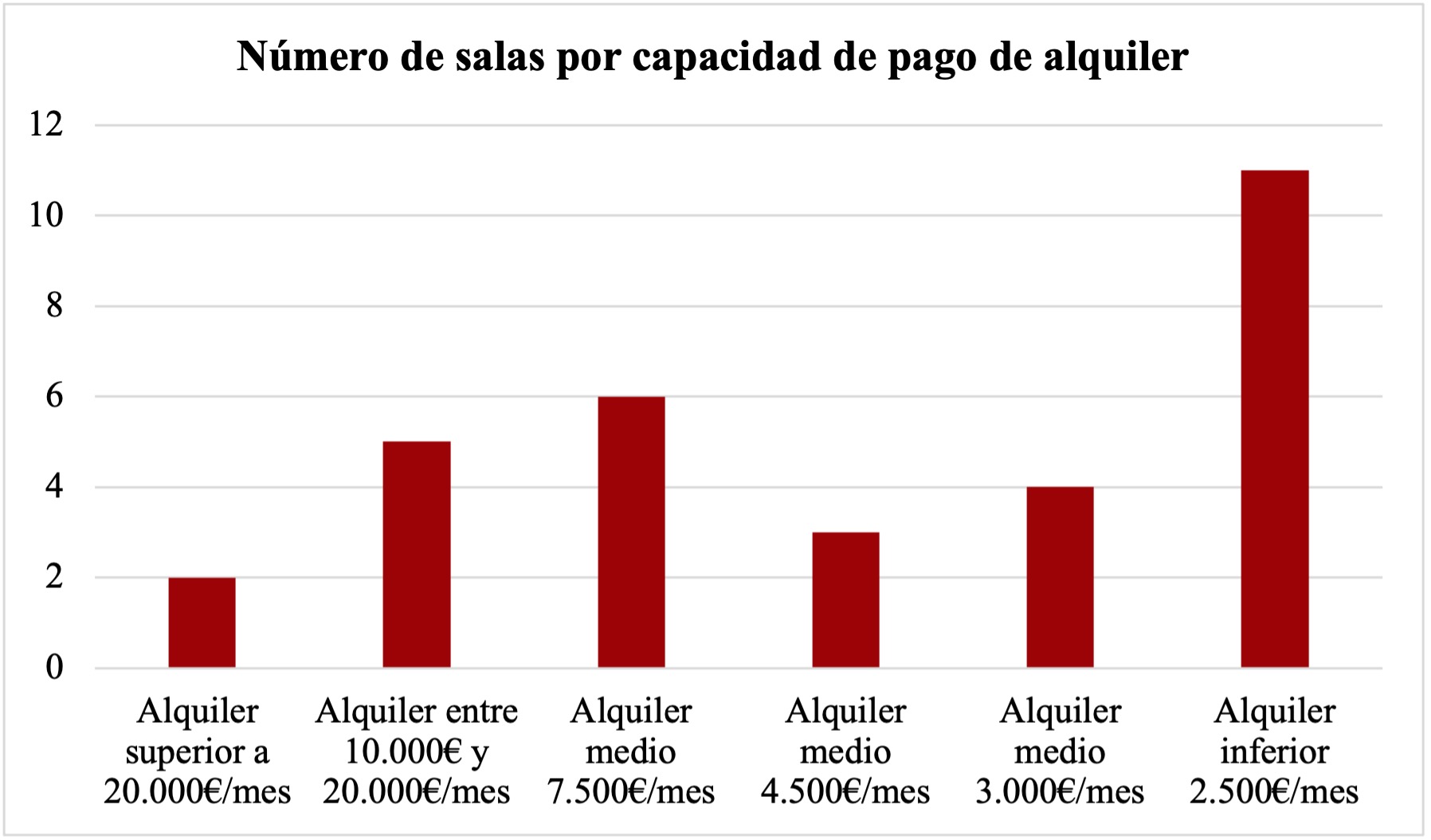 Se recoge en la Gráfico 8, los dos importes que equivalen al 10% y 15%, respectivamente, de los ingresos de cada sala, datos extraídos de las cuentas anuales del 2022 publicadas en SABI Informa, que corresponden a su vez a la renta media y máxima mensual que podría teóricamente pagar cada una de las salas. Se extrae de dicho análisis que, de las 26 salas analizadas, tres de ellas tienen una capacidad de pago superior a 20.000 euros mensuales, y el 50% de las salas tienen capacidad de pago por encima de la media de 7.500 euros mensuales, sin embargo, el 30% de ellas no generó suficiente caja en 2022 para asumir un alquiler mensual superior a 3.500 euros.