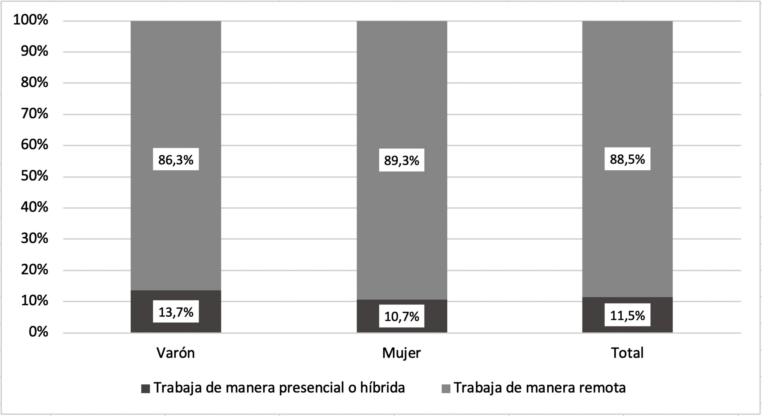 En paralelo, la extensión acelerada del teletrabajo implicó para las personas cuidadoras una sobrecarga de responsabilidades y exigencias en un contexto de ausencia total de redes. Tanto varones como mujeres ocupadxs se vieron en gran medida afectadxs por el trabajo remoto: el porcentaje de personas que realizaban trabajo remoto ascendía en ambos géneros a más de un 80% (Gráfico 1). En este contexto, podría haberse esperado que, en los hogares con niñxs y/o adolescentes, las tareas reproductivas se distribuyeran de manera más o menos equitativa entre ambos géneros. Sin embargo, esas tareas recayeron fundamentalmente en las mujeres, lo que reprodujo y profundizó patrones de desigualdad de género en un contexto en que, además, todo ese esfuerzo realizado por ellas quedó relegado al ámbito cerrado del espacio de lo privado y, por lo tanto, completamente invisibilizado (Marcús et al., 2020).