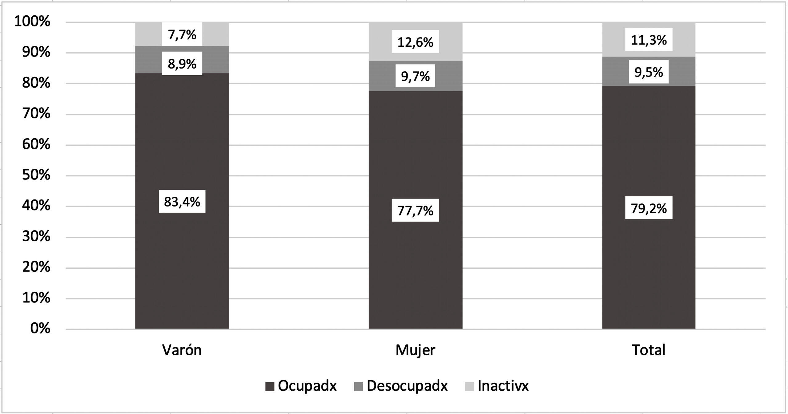 Gráfico 2. Condición de actividad según género. Personas encuestadas del AMBA en hogares con niñxs y/o adolescentes durante la etapa de ASPO estricto, 2020