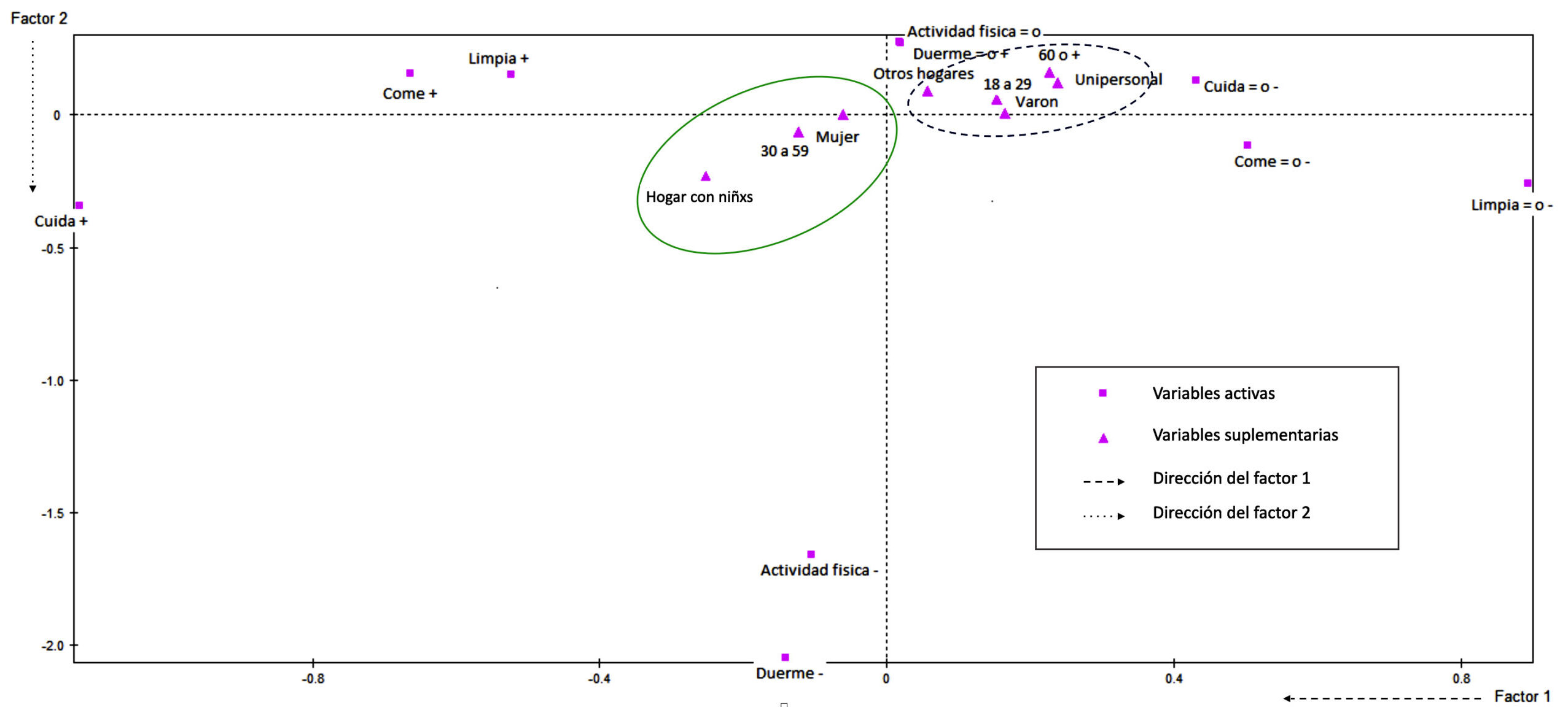 En términos “geométricos”, encontramos que el espacio social que se conforma distribuye por un lado a quienes aumentaron su carga de tareas domésticas y de cuidado (el grupo a la izquierda del eje central) y, por otro, a aquellxs que mantuvieron o disminuyeron el tiempo dedicado a estas prácticas (el grupo a la derecha del eje central). Estas prácticas que constituyen el factor “Cuidado de otrxs” (factor 1) implican tareas de las que se beneficia todo el hogar, aunque no pareciera que beneficien a quien las lleva a cabo. De este modo, mientras que quienes se concentran hacia la izquierda del eje vertical son quienes han aumentado la carga de cuidados y otras tareas domésticas, son al mismo tiempo quienes han bajado la cantidad de tiempo destinado a dormir y a la actividad física, dado que se sitúan por debajo del eje horizontal: mujeres, personas adultas de mediana edad con niñxs y/o adolescentes a cargo. Es decir que a la vez que aumenta el “Cuidado de otrxs” disminuye el “Autocuidado” (factor 2): fueron lxs que más cuidaron quienes, a la vez, menos tiempo dedicaron a cuidar de sí mismxs. Ahora bien, quienes no vieron aumentada la carga de cuidar a otrxs son las personas jóvenes de 18 a 29 años y quienes habitan en hogares unipersonales o en otros tipos de hogar (que incluye a personas que conviven pero no tienen niñxs a cargo), personas adultas mayores y varones. Estos últimos tienden a poder dormir igual o más que antes del aislamiento obligatorio y a dedicarle igual o más tiempo a realizar actividad física dentro de la vivienda, es decir, disponen de un tiempo propio para poder cuidarse a sí mismos.