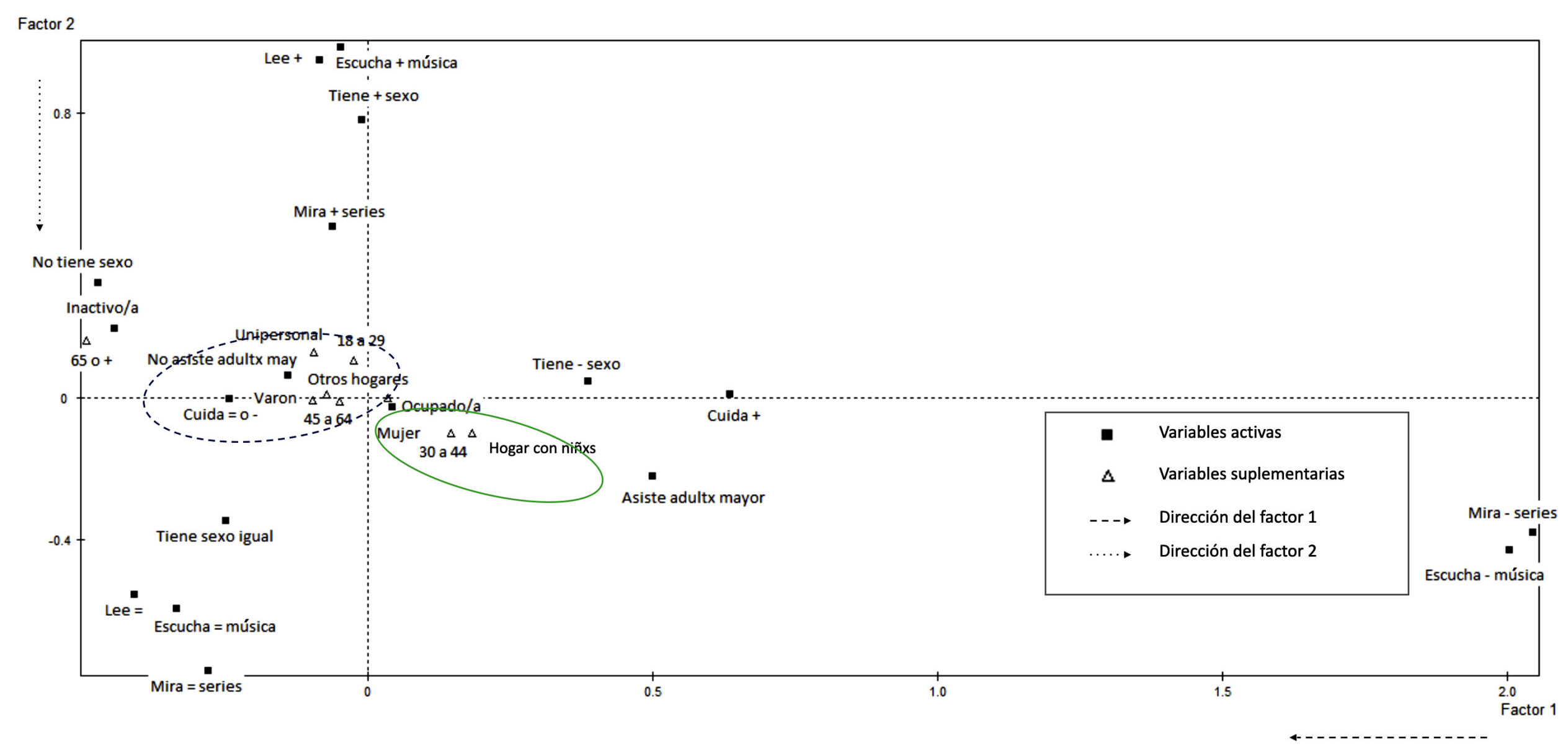 Ahora bien, en nuestro análisis observamos que, al igual que en el caso de la distribución del tiempo entre trabajo reproductivo y remunerado que desarrollamos en el apartado anterior, la posibilidad de disfrute del ocio se vio afectada por diversos atributos de las personas en términos de género, edad y forma del hogar (Gráfico 4). De este modo, actividades de uso del tiempo libre en la vivienda, como leer, mirar películas y/o series, escuchar música o tener sexo, se conforman también de manera diferenciada de acuerdo con estos grupos: quienes tuvieron a su cargo el cuidado de otrxs redujeron, durante el aislamiento, el tiempo que dedicaban a estas prácticas. Este grupo, en términos socio-demográficos, estuvo nuevamente conformado por personas adultas, mujeres y, en particular, que habitan en hogares con niñxs a cargo, cuyos individuos se ubican hacia la parte inferior derecha del gráfico. La reducción del tiempo dedicado a prácticas de ocio se ubica claramente a lo largo del primer factor y empuja el espacio de las prácticas hacia la derecha. Sobre este mismo eje se ubica el aumento de tareas de cuidado en la misma dirección y, hacia el lado izquierdo, su mantenimiento o reducción durante el aislamiento. A este eje podemos denominarlo, entonces, como el eje que da cuenta de la “Pérdida de espacios de ocio” (factor 1), donde las mujeres y madres que, previo a la pandemia, podían invertir tiempo libre en el desarrollo de este tipo de actividades se encontraron restringidas de disponer de tiempo libre por fuera del tiempo de trabajo remunerado y el tiempo de trabajo reproductivo. El segundo factor se vincula de manera complementaria con el primero, y da cuenta del aumento durante el aislamiento del tiempo dedicado a prácticas de ocio. Podemos denominar este eje como “Oportunidad en el uso del tiempo” (factor 2), que se traza desde la ausencia de oportunidad (lo cual, a diferencia del otro eje no implica pérdida) a la posibilidad de reapropiación de ese tiempo libre que antes estaba ocupado con responsabilidades del mundo exterior. Dentro de este grupo se concentran las personas jóvenes de 18 a 29 años, quienes habitan en hogares unipersonales u otro tipo de hogares, y que no vieron aumentadas sus tareas de cuidado a cargo. A diferencia de aquellas personas que mayormente se dedicaron a cuidar y vieron reducido su tiempo de ocio, para este grupo se abrió una oportunidad de disfrute durante el aislamiento, vinculada al detenimiento de la vida cotidiana tal como la conocemos, y a una mayor disponibilidad de tiempo para dedicar a prácticas de ocio. Nuevamente, se observa una tendencia a que las mujeres, las personas adultas y aquellas con hijxs sufrieran un mayor déficit de uso del tiempo libre que otros grupos sociales, aun cuando esas prácticas de ocio se vieron reducidas al espacio de lo doméstico.