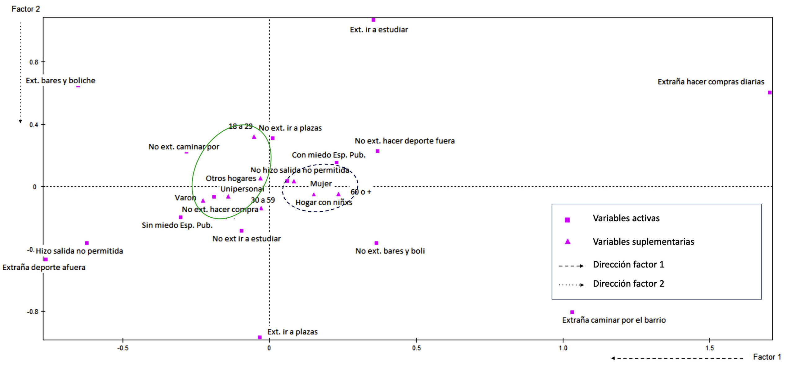 Además de atributos sociodemográficos, laborales y educativos, en nuestro relevamiento indagamos por los cambios en toda una serie de prácticas vinculadas con el uso del tiempo productivo, reproductivo y de ocio, así como por una serie de percepciones y sentimientos vinculados al espacio público. En nuestro modelo de análisis, las dimensiones referidas a prácticas o percepciones se escogieron como variables activas del análisis, mientras que las variables sociodemográficas y laborales cumplieron la función de suplementarias. Esto quiere decir que el espacio que analizaremos está determinado por las prácticas o percepciones, dado que el objetivo del análisis son las relaciones entre estos aspectos de la vida cotidiana en la pandemia. Las características estructurales simplemente se ubican en este mapa, de acuerdo con su mayor o menor asociación con ellas, pero no contribuyen a estructurar el espacio. Se espera, entonces, que la técnica de visualización permita intuir las relaciones sociológicas entre los aspectos más estructurales de los hogares de las personas encuestadas y el espacio de sus prácticas y sentimientos durante la etapa de aislamiento estricto.