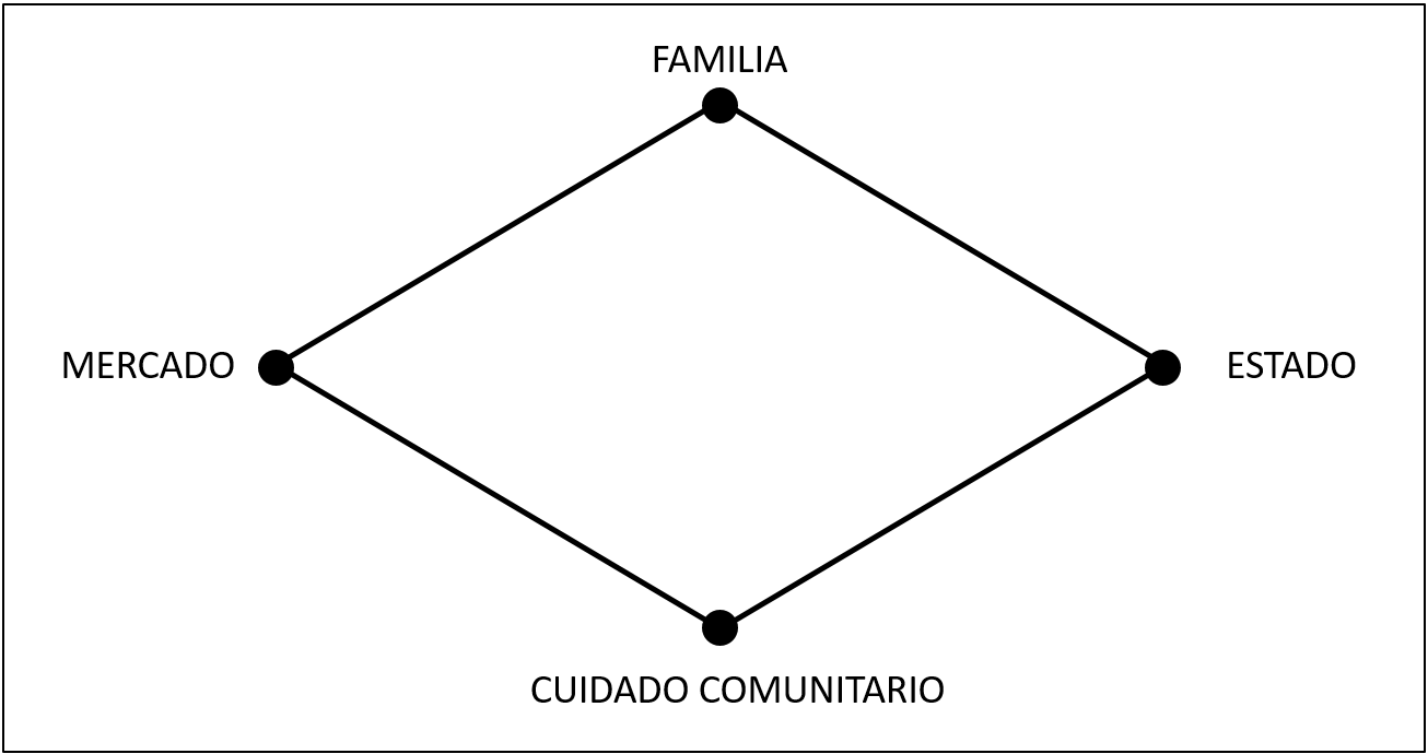 El cuidado, sin embargo, no es una actividad que se restrinja al seno del hogar. Por el contrario, existe una organización social del cuidado que abarca cuatro grandes actores interrelacionados que lo proveen y distribuyen: el Estado, mediante las políticas públicas de cuidado; el mercado, mediante la provisión de servicios mercantiles de cuidado institucionales o individuales a los que puede acceder la población con determinado poder adquisitivo; los hogares, mediante la provisión de trabajo de cuidado no remunerado realizado por sus miembros; y la comunidad, a través de arreglos comunitarios de cuidado (Razavi, 2007; Zibecchi, 2013). Esta figura conocida como el “diamante del cuidado” (ver Figura 1) representa la provisión de cuidados como algo que no ocurre de manera aislada, sino que resulta de una continuidad donde se suceden actividades, trabajos y responsabilidades entre los distintos actores (Rodríguez Enriquez y Marzonetto, 2015).