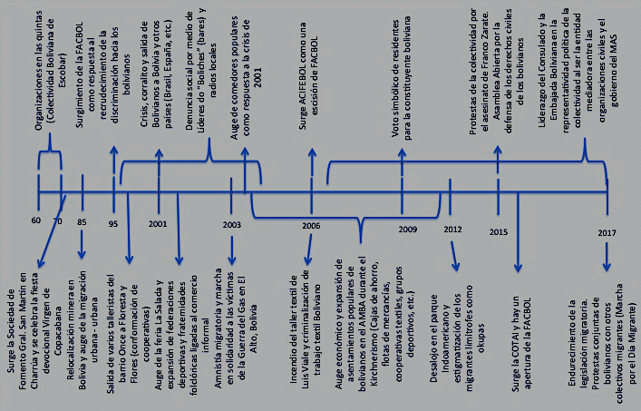 Podemos encontrar un correlato en la expansión de la migración boliviana hacia el amba (década de los años setenta y de los años ochenta) y la atomización de la Asociación de Bolivianos en Buenos Aires (la organización perdió su sede en 1977), a la que le sucedió un periodo de fragmentación organizativa y de auge federacionista.